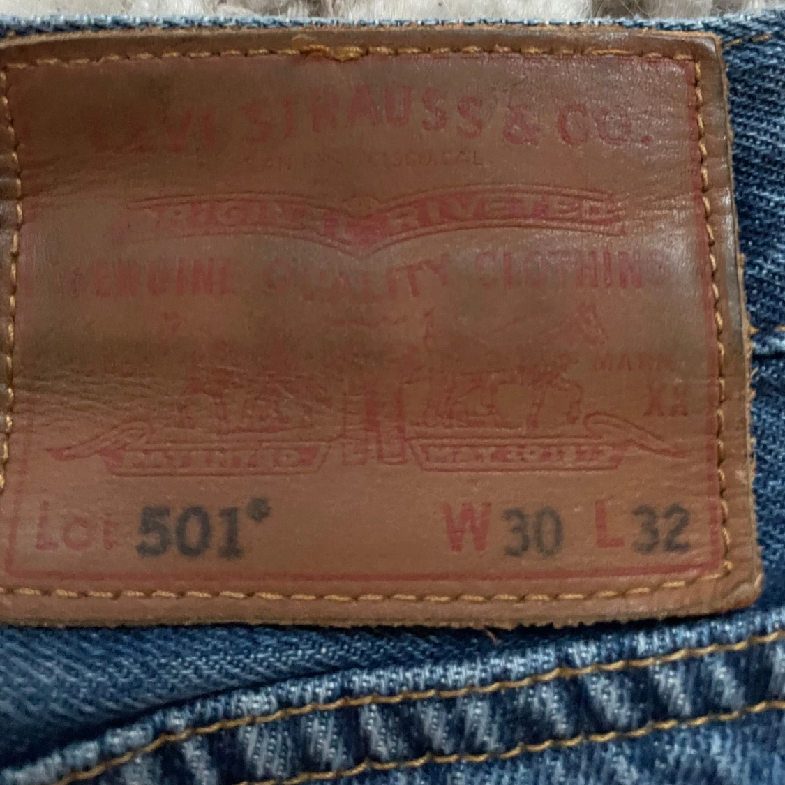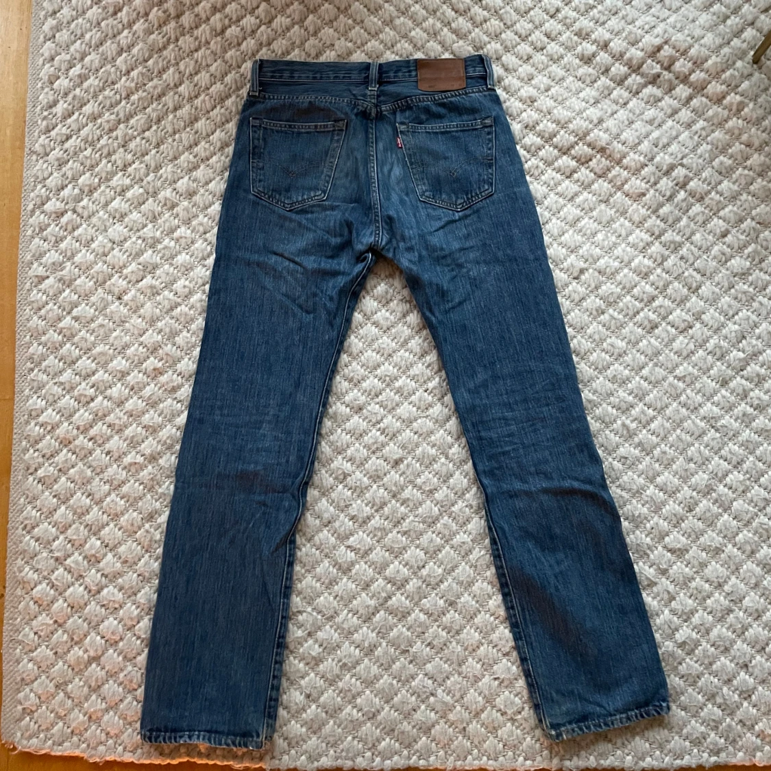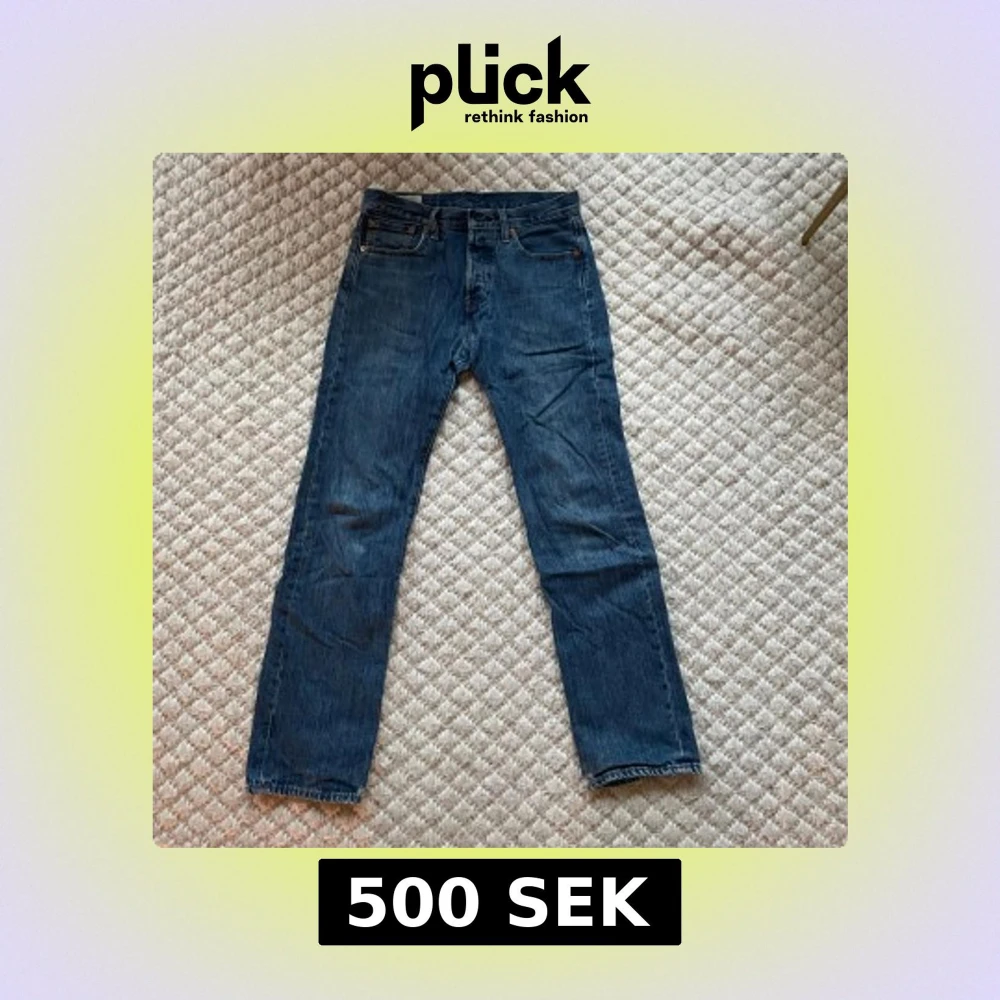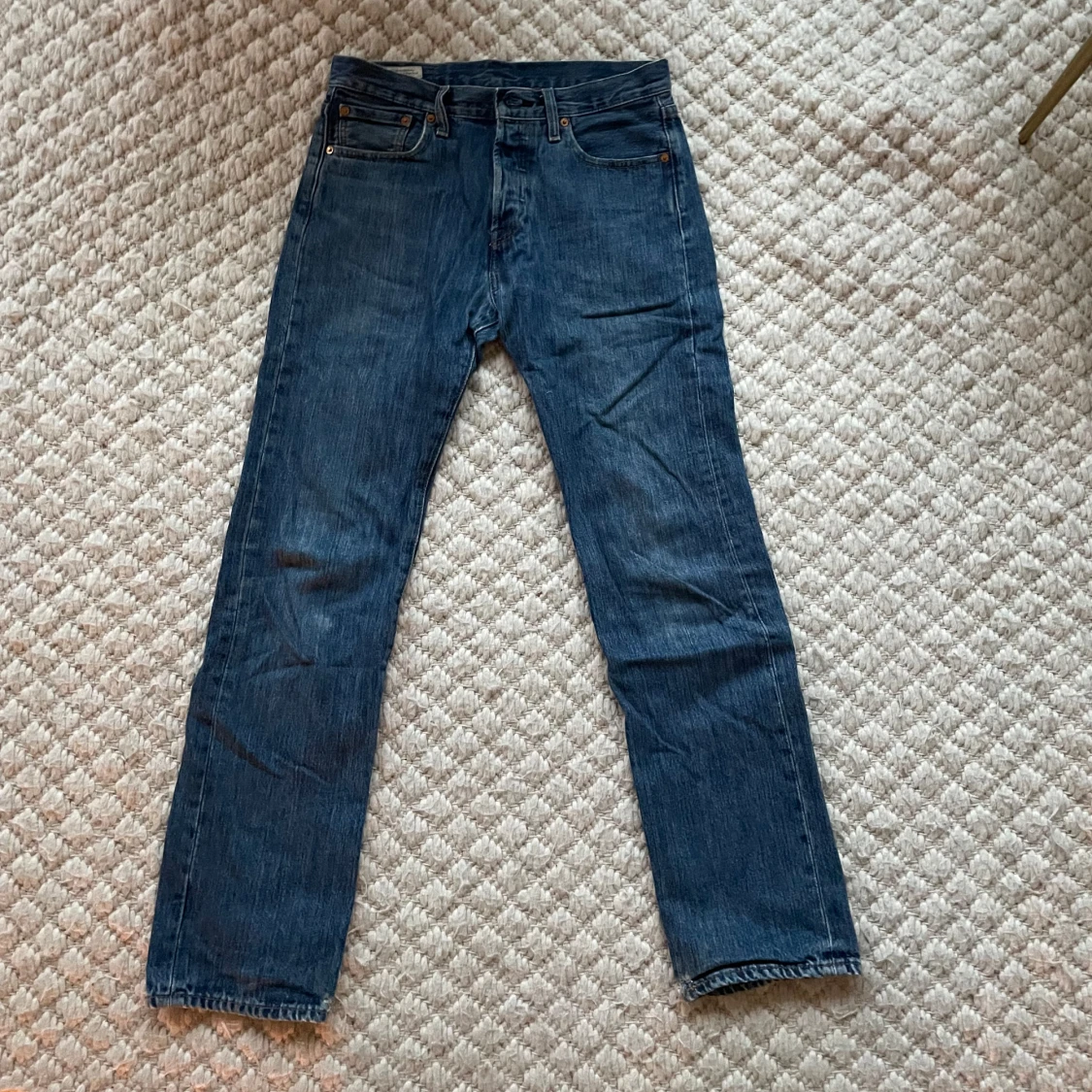 Klassiska blå Levis 501 jeans med rak passform och knappgylf. Perfekta för en avslappnad stil. Tillverkade i slitstarkt denim. Nypris 1200. Lite slitna längd nere på jeansen.