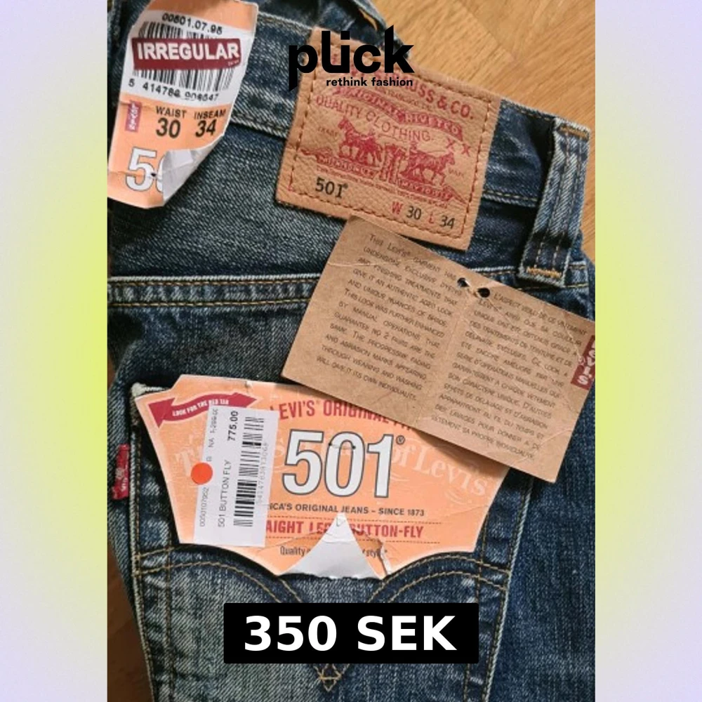 Säljer ett par helt oanvända klassiska Levi's 501 jeans i blå tvätt med slitningar och distressed detaljer. Modellen har rak passform, knappgylf och fem fickor. Jeansen har en cool vintage look och är tillverkade i robust denim.