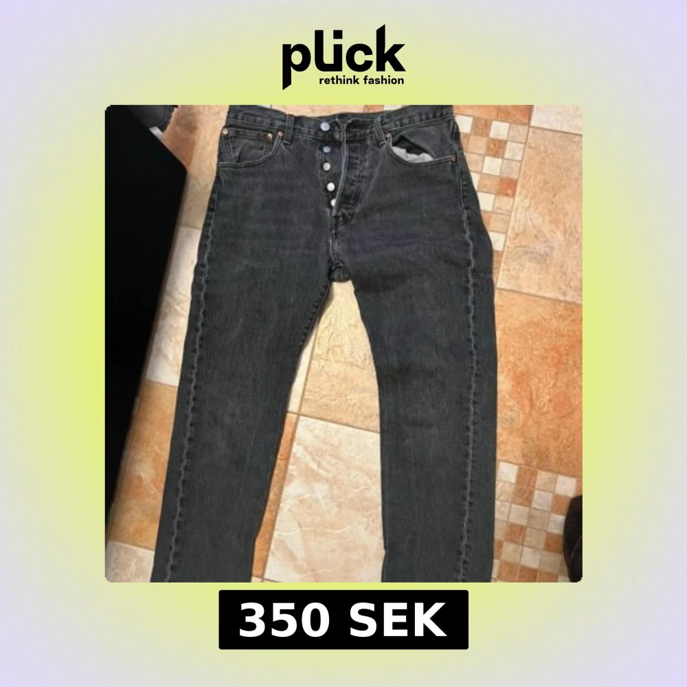 Säljer ett par klassiska svarta Levi's jeans med knappgylf. De har en rak passform och är tillverkade i slitstarkt denim. Perfekta för en stilren look.
