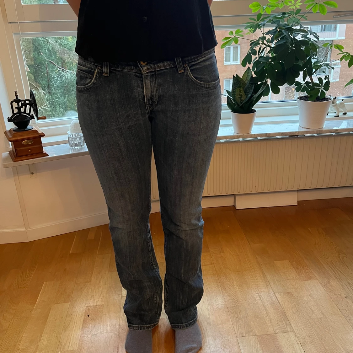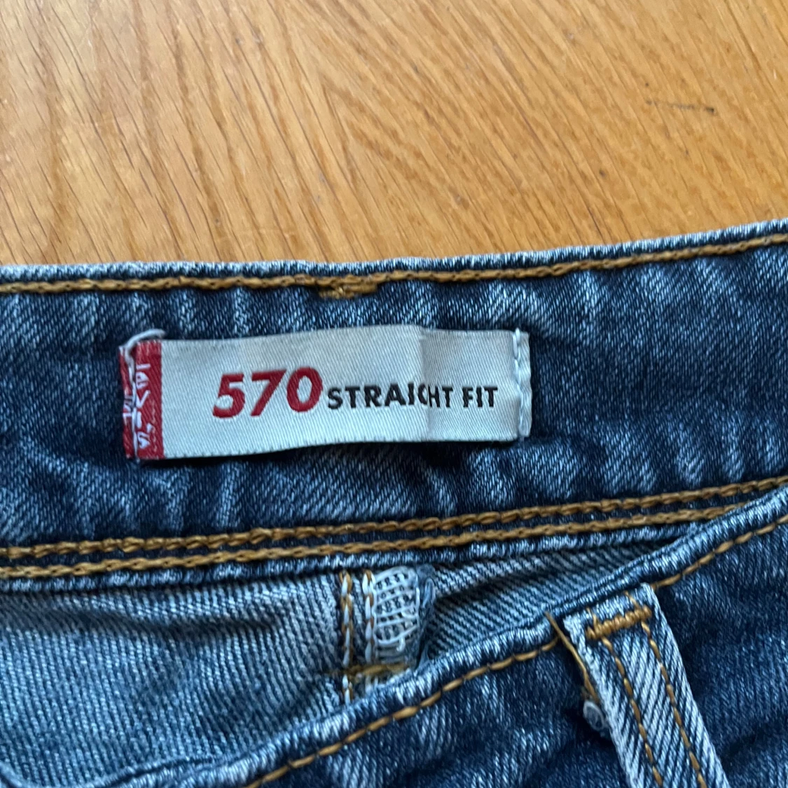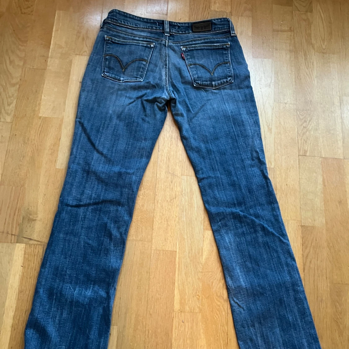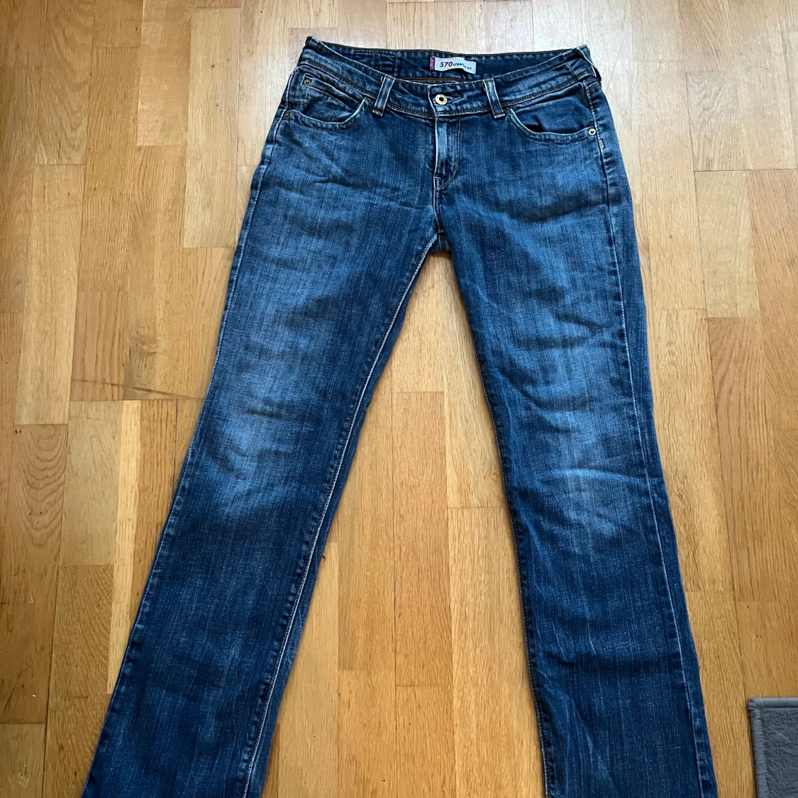 Säljer ett par klassiska Levi's 570 jeans i blå tvätt med bootcut-snitt. De har fem fickor, låg midja och snygga slitningar för en cool look. Materialet är robust denim och passformen är loose. Perfekta för dig som gillar retrostil och vill ha bekväma jeans. Passar dig med storlek S eller 36/38