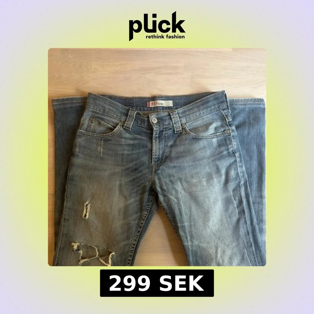 Säljer ett par blå jeansbyxor från 511 Slim med slitningar och hål på ena benet. Jeansen har klassisk femficksdesign, normalhög midja och smal passform. Perfekta för en avslappnad och trendig look. Bara höra av sig vid eventuella funderingar!