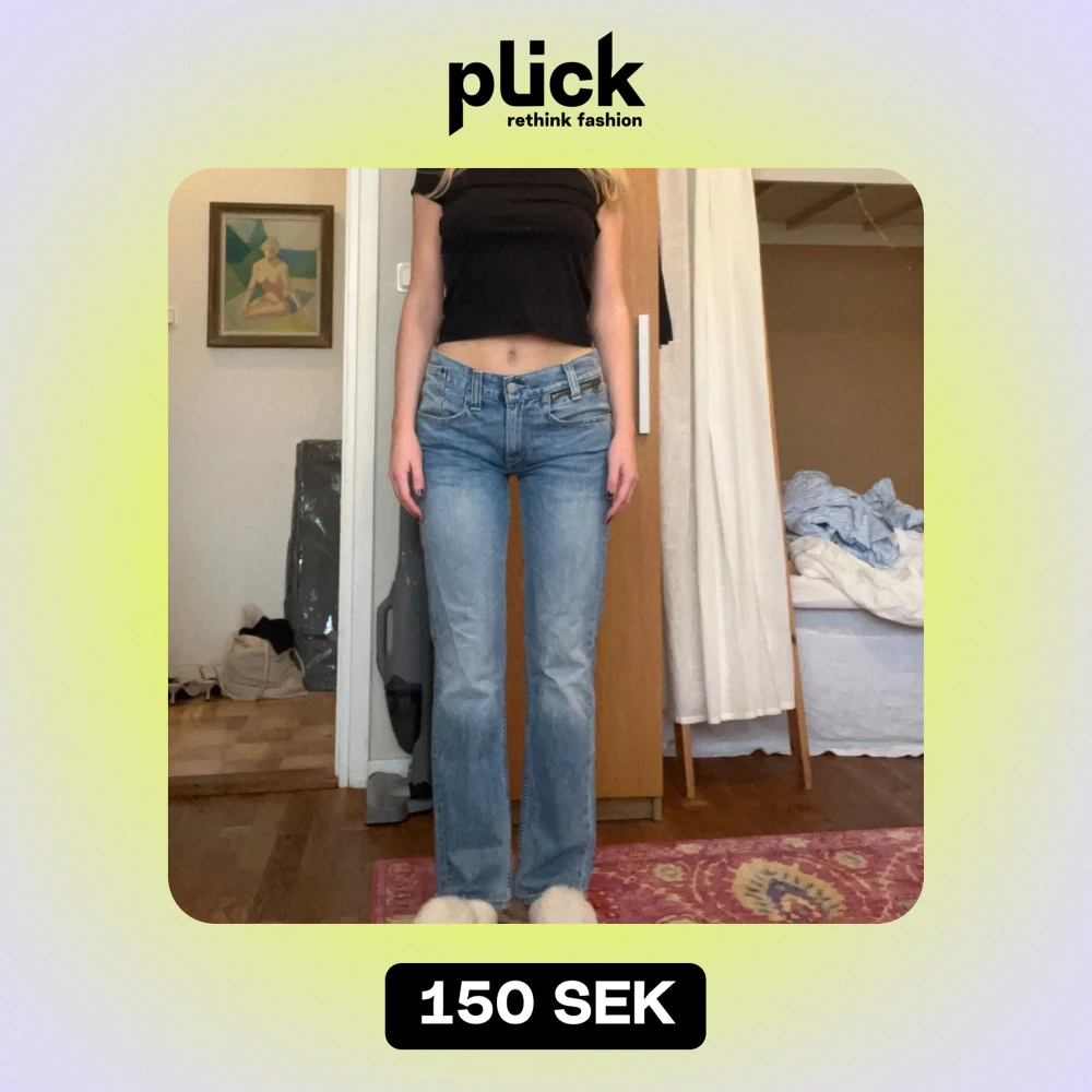 Blå jeans - Söker dessa super snygga lågmidjade bootcut jeans. Perfekta jeans till vintern eller hösten💗 Säljer då de tyvärr är för små för mig. De säljs inte längre i butik/online nya. Midjemått på näst sista bilden och innerbens måttet på sista bilden💗