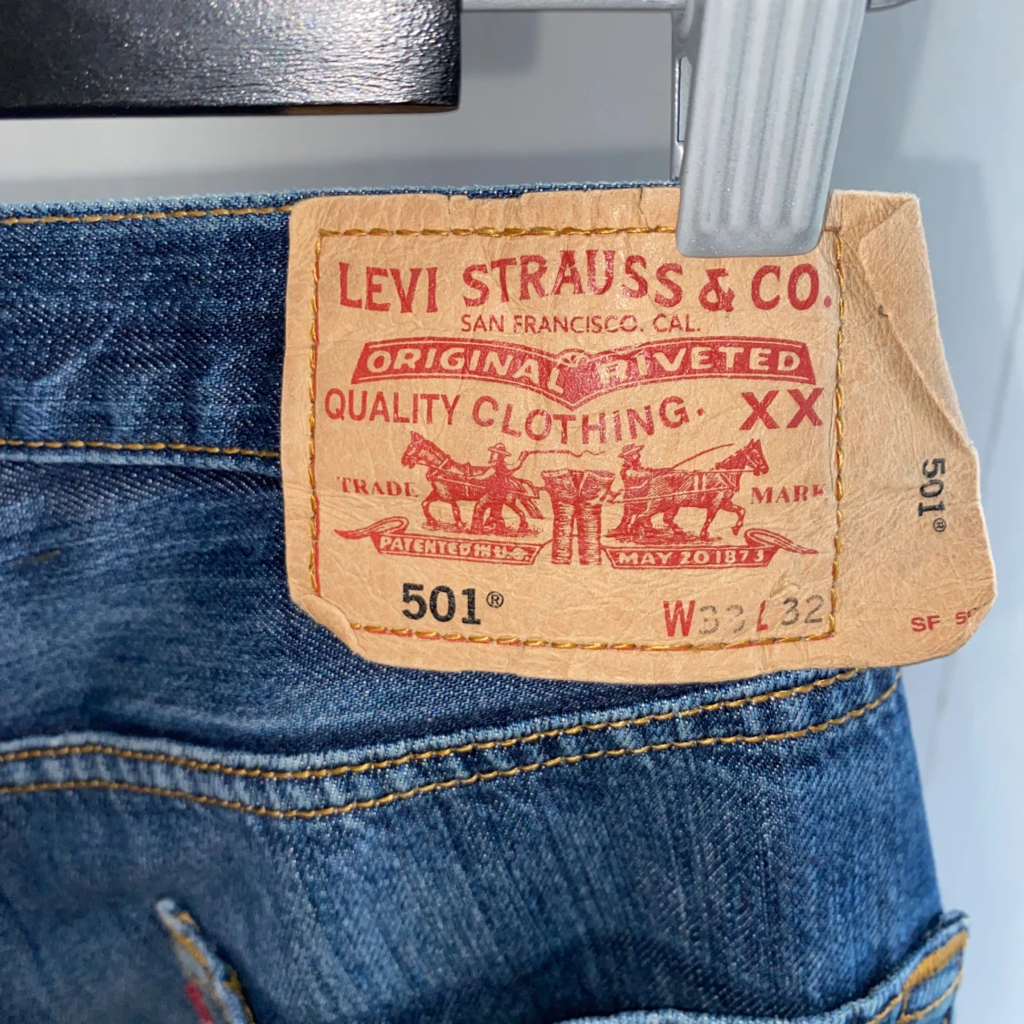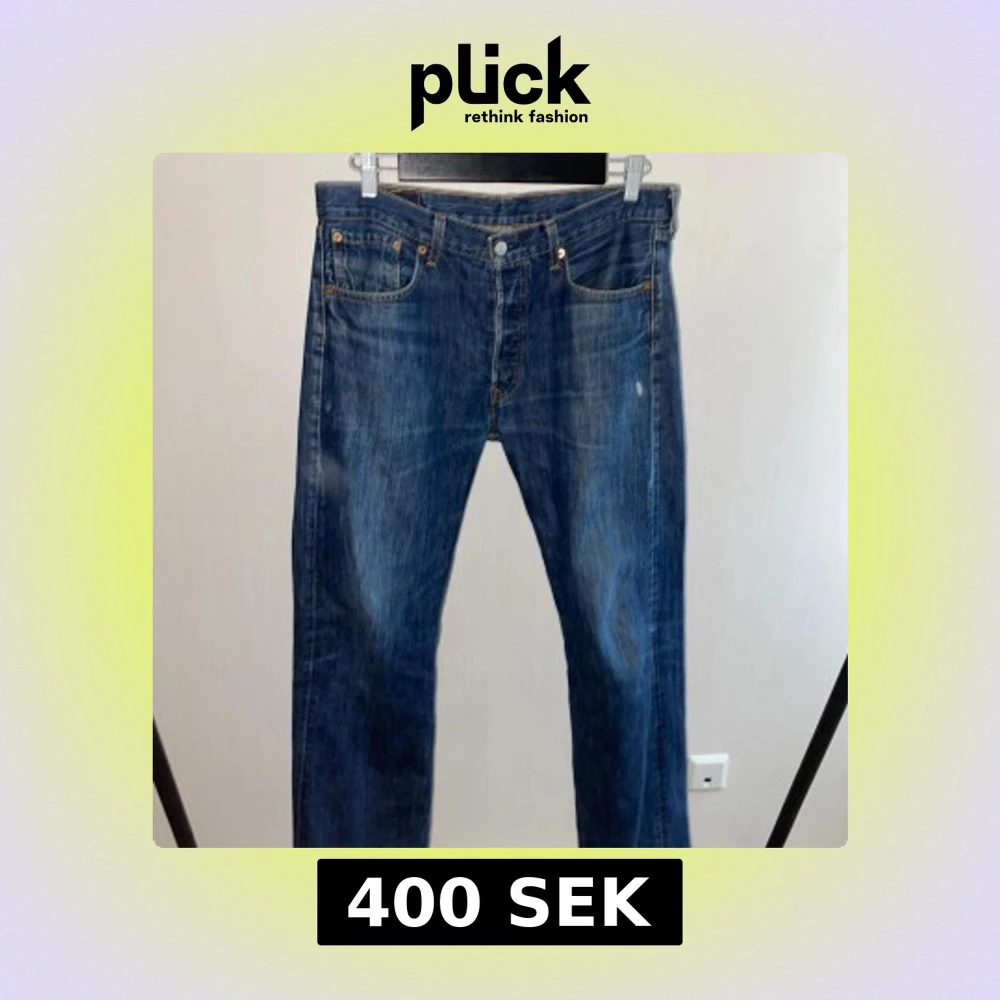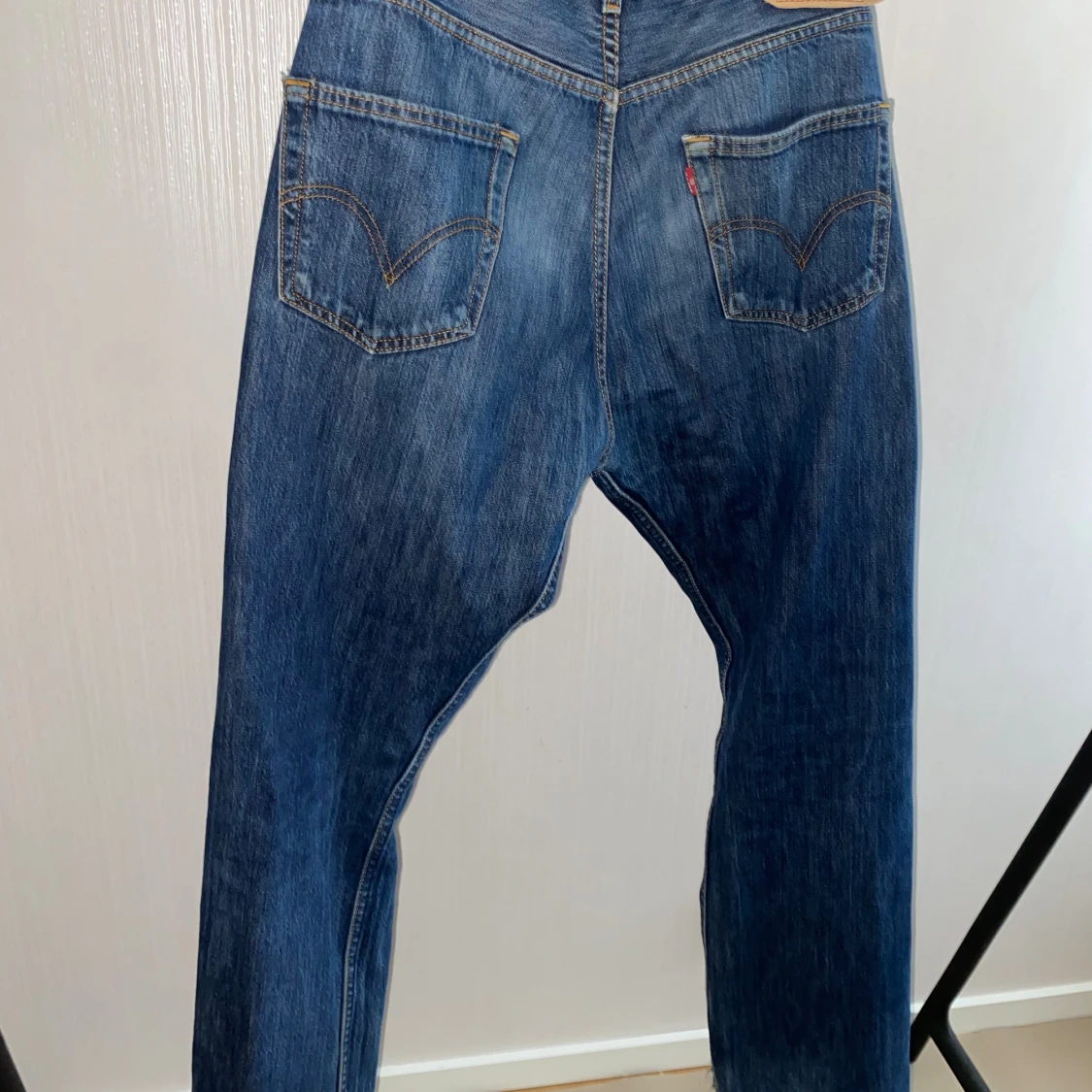 Klassiska Levi's 501 jeans i blå denim med raka ben och femficksmodell. Jeansen har knäppning fram, tydliga kontrastsömmar och den ikoniska läderpatchen bak i midjan. Perfekta för dig som gillar tidlös stil och vill ha ett par riktigt schyssta jeans.