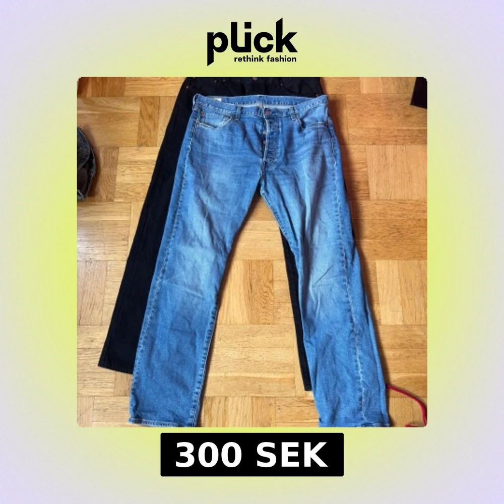 Säljer ett par klassiska Levis 501 jeans i ljusblå tvätt med raka ben och normal passform. Jeansen har fem fickor och knappgylf. Bakom ligger ett par svarta byxor med rak siluett, perfekta för en clean och enkel stil. 300kr för båda