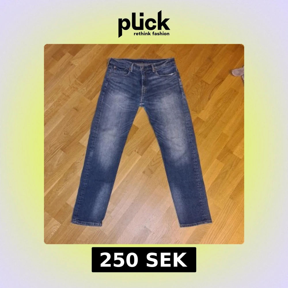 Säljer ett par klassiska Levi's 502 jeans i blå denim. De har en straight passform. Det är ett litet hål vid skrevet, se bild.