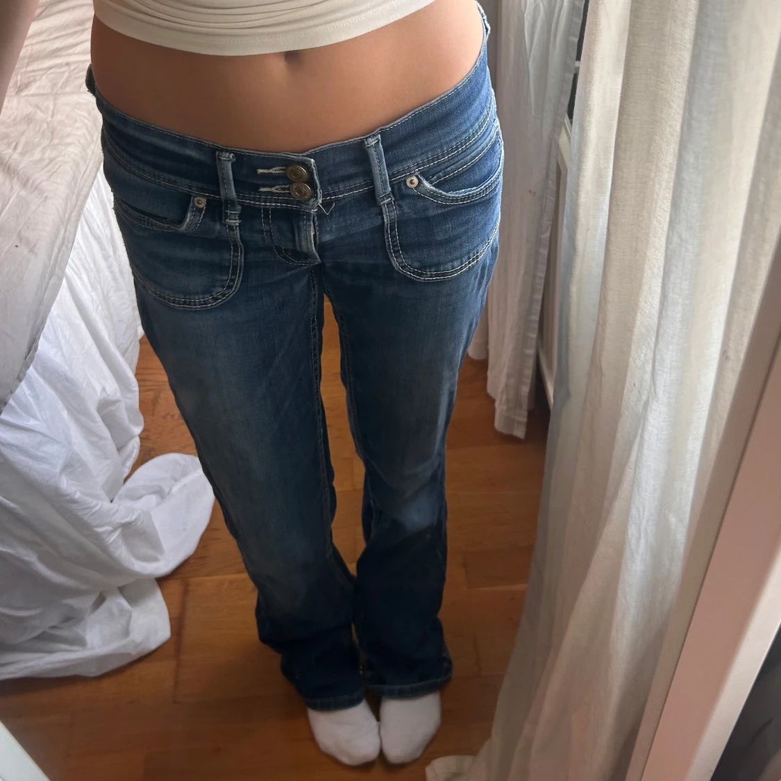 Säljer ett par blå jeans med snygg bootcut och låg midja. Jeansen har dubbla knappar, markerade sömmar och coola fickdetaljer både fram och bak. Perfekta för dig som gillar en avslappnad men trendig look.
