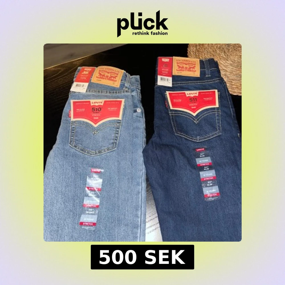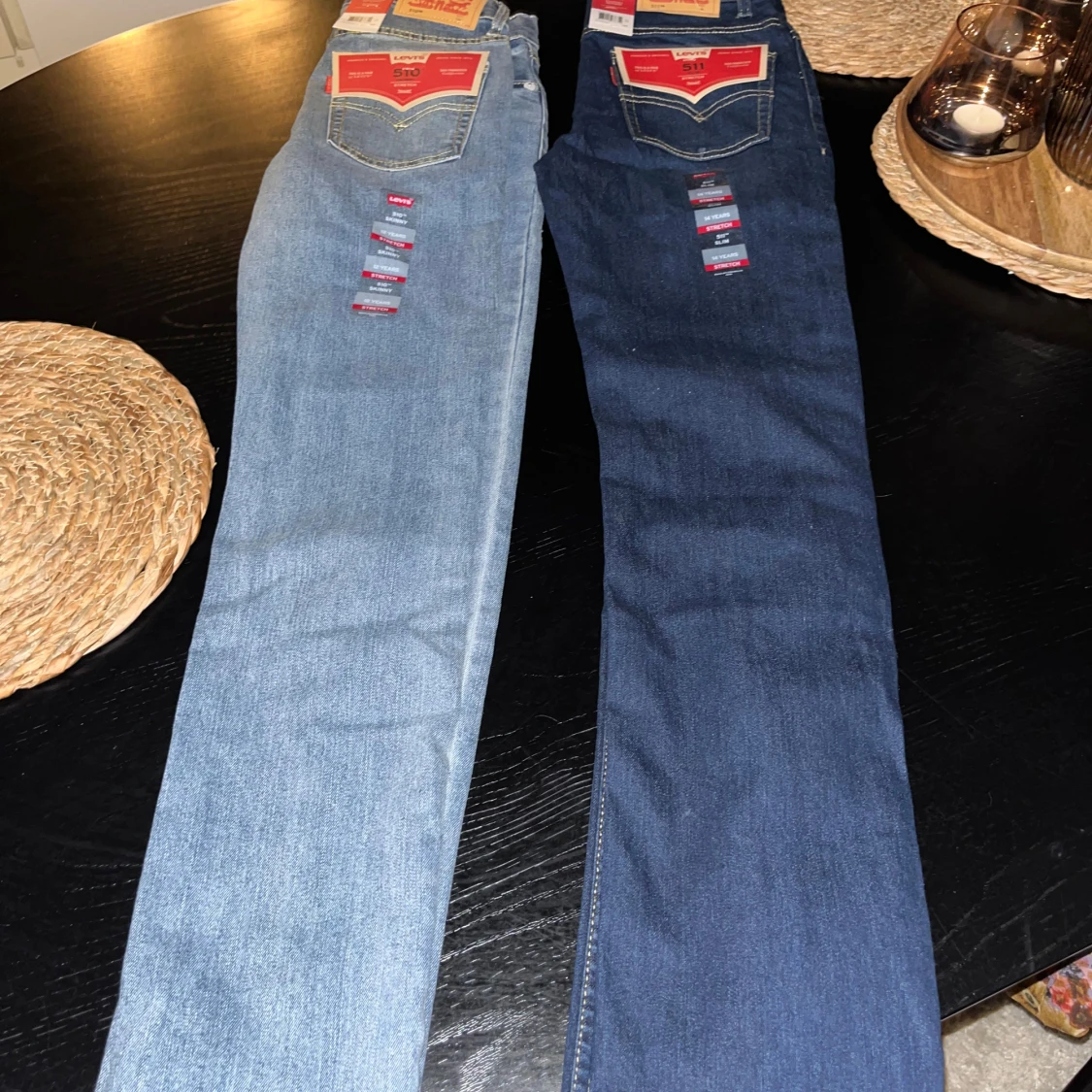 Två par Levi's jeans: ett par ljusblå 510 skinny stretch och ett par mörkblå 511 slim stretch. Båda har klassisk femficksdesign, Levi's logga på bakfickan och är tillverkade i stretchigt jeanstyg för extra komfort. Perfekta för dig som gillar en snygg och modern passform. Båda för 500 kr