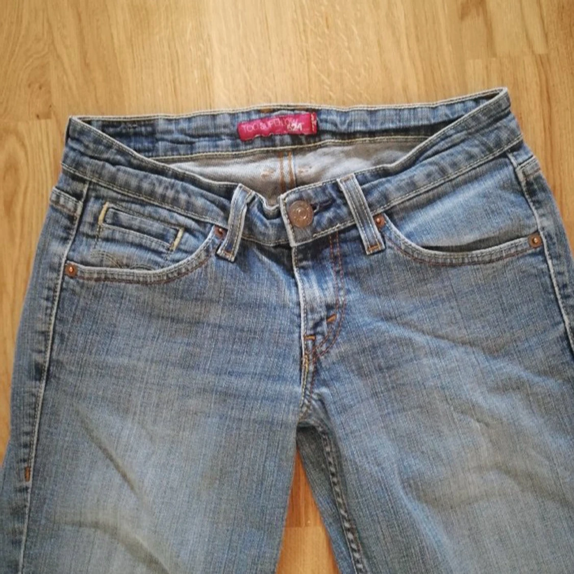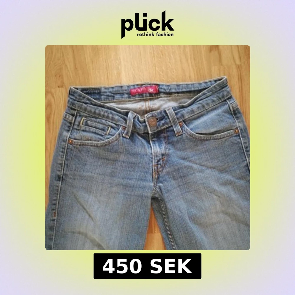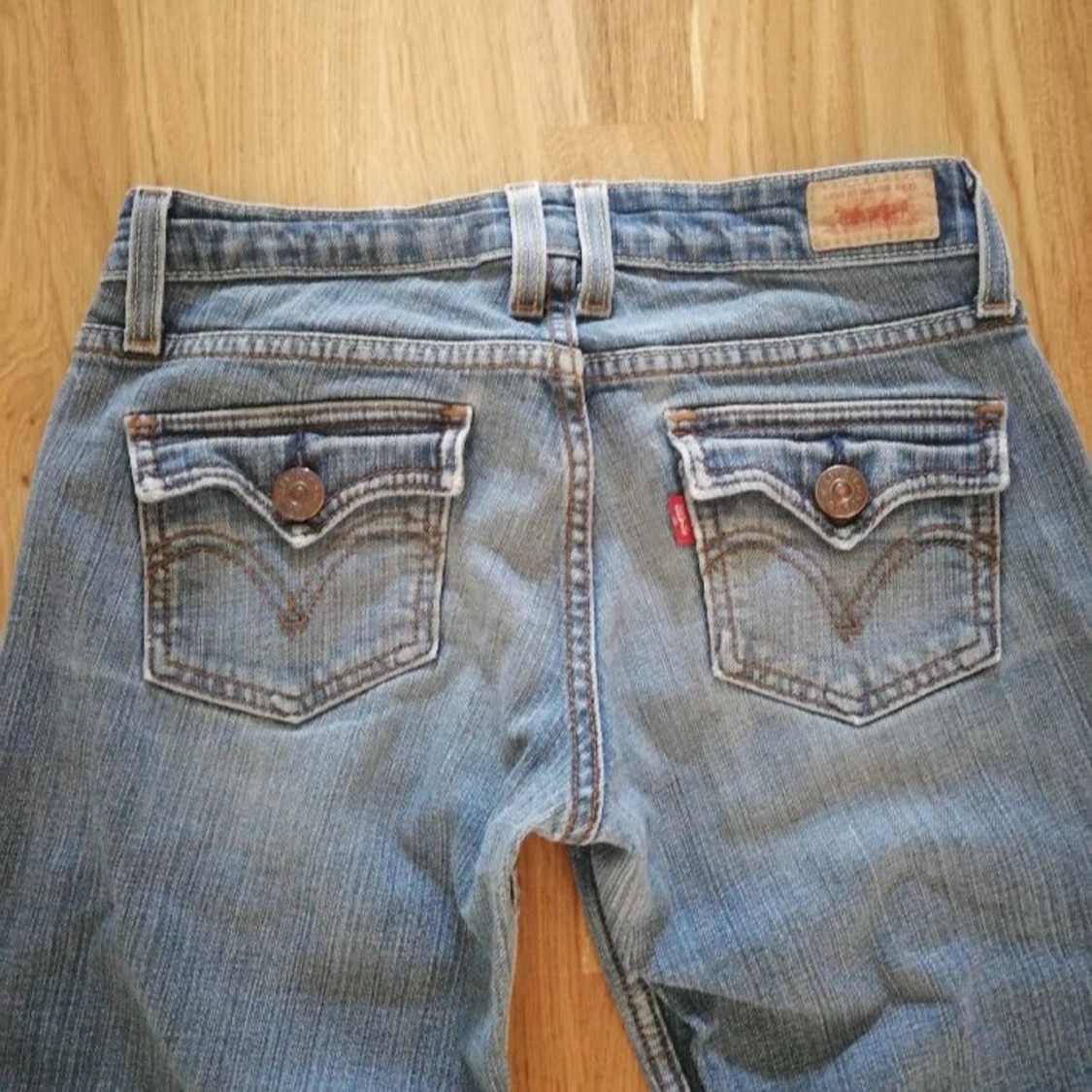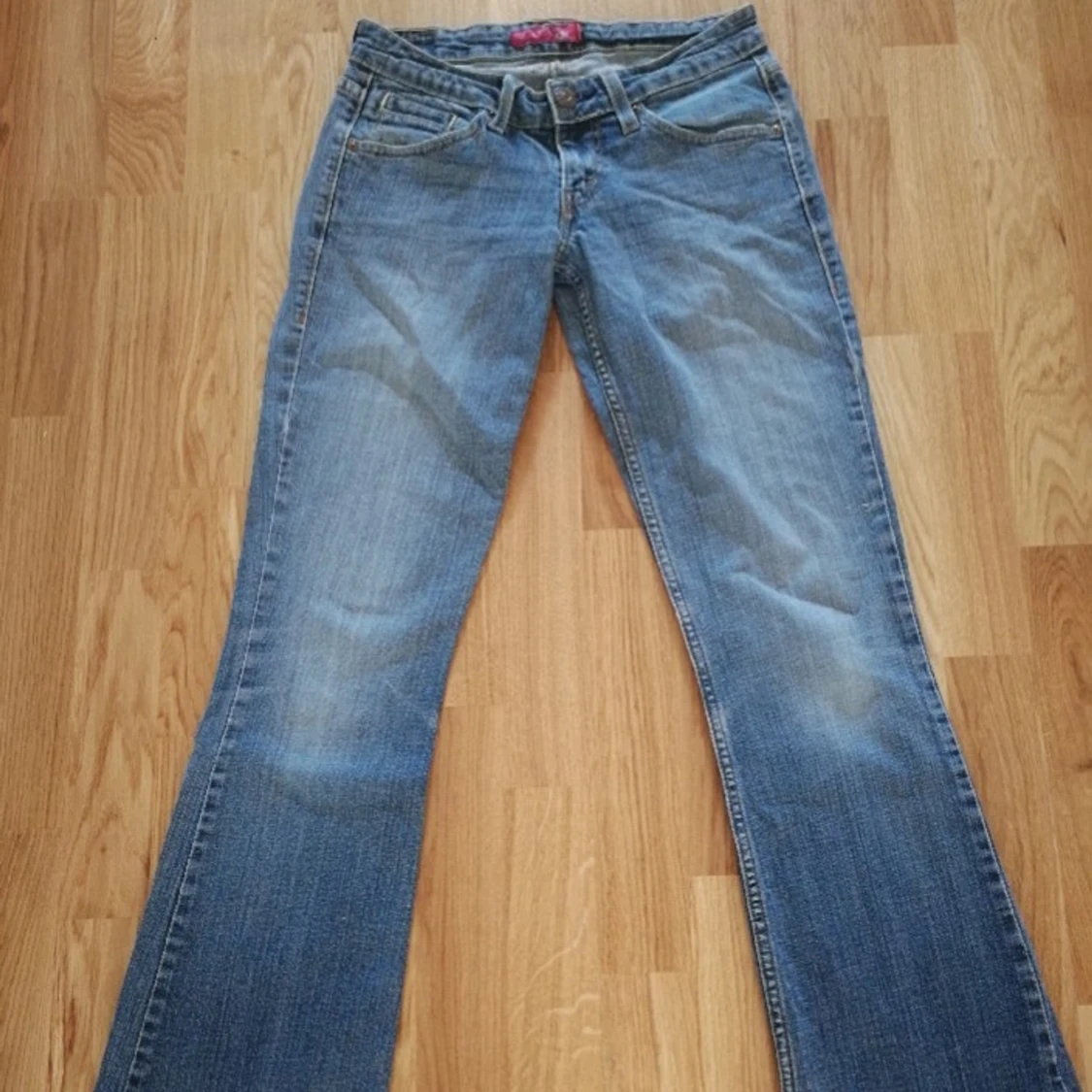 Snygga blå jeans från Levi's med klassisk femficksdesign och coola ficklock bak med knappar. Jeansen har bootcut-ben och låg midja, tillverkade i slitstarkt denim. Säljer då de tyvärr är för stora 💕