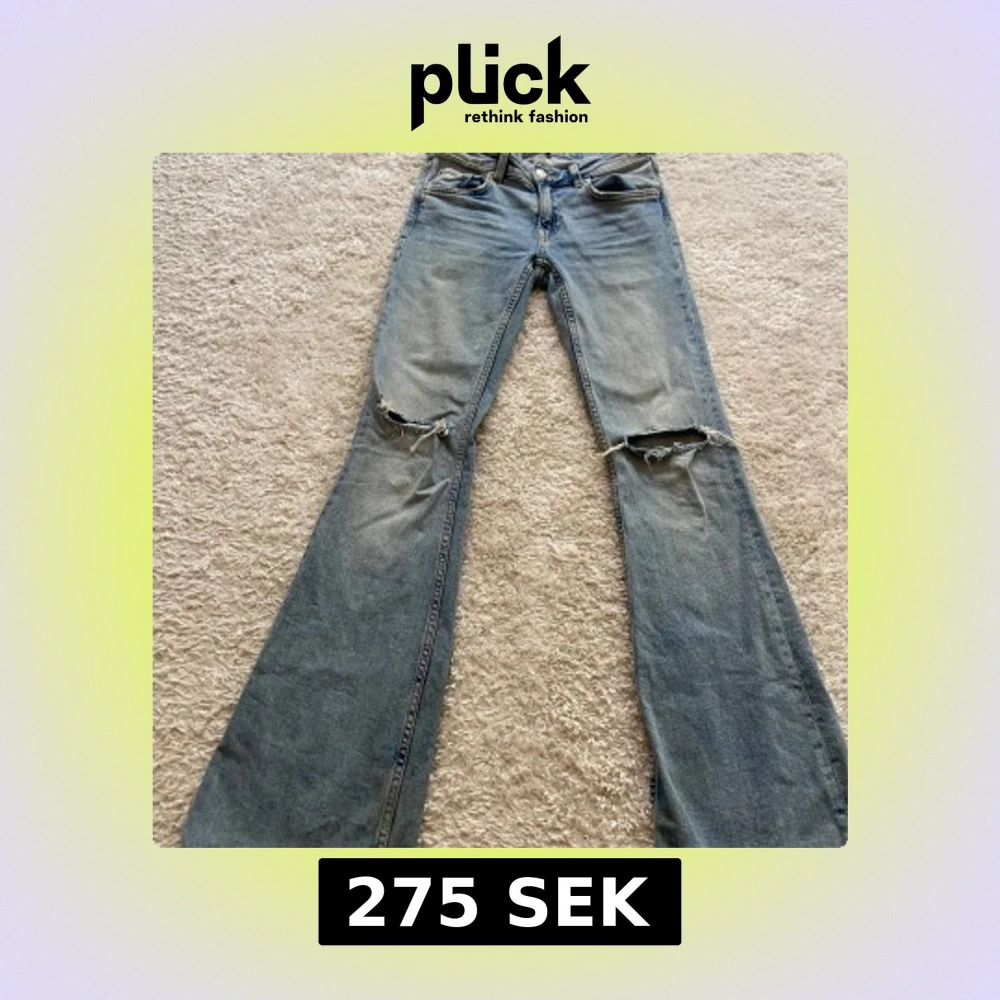 Säljer mina älskade jeans som tyvärr har blivit för små !!❤️😞Ljusblå jeans med bootcut passform och slitna hål på båda knäna. Klassisk femficksmodell med dragkedjegylf och snyggt tvättad denim. Perfekta för dig som gillar en avslappnad och retro vibe.