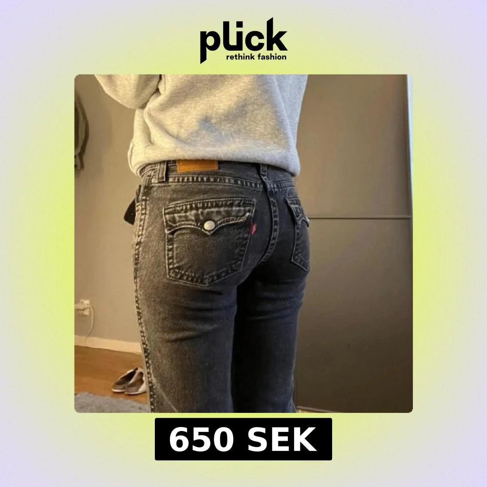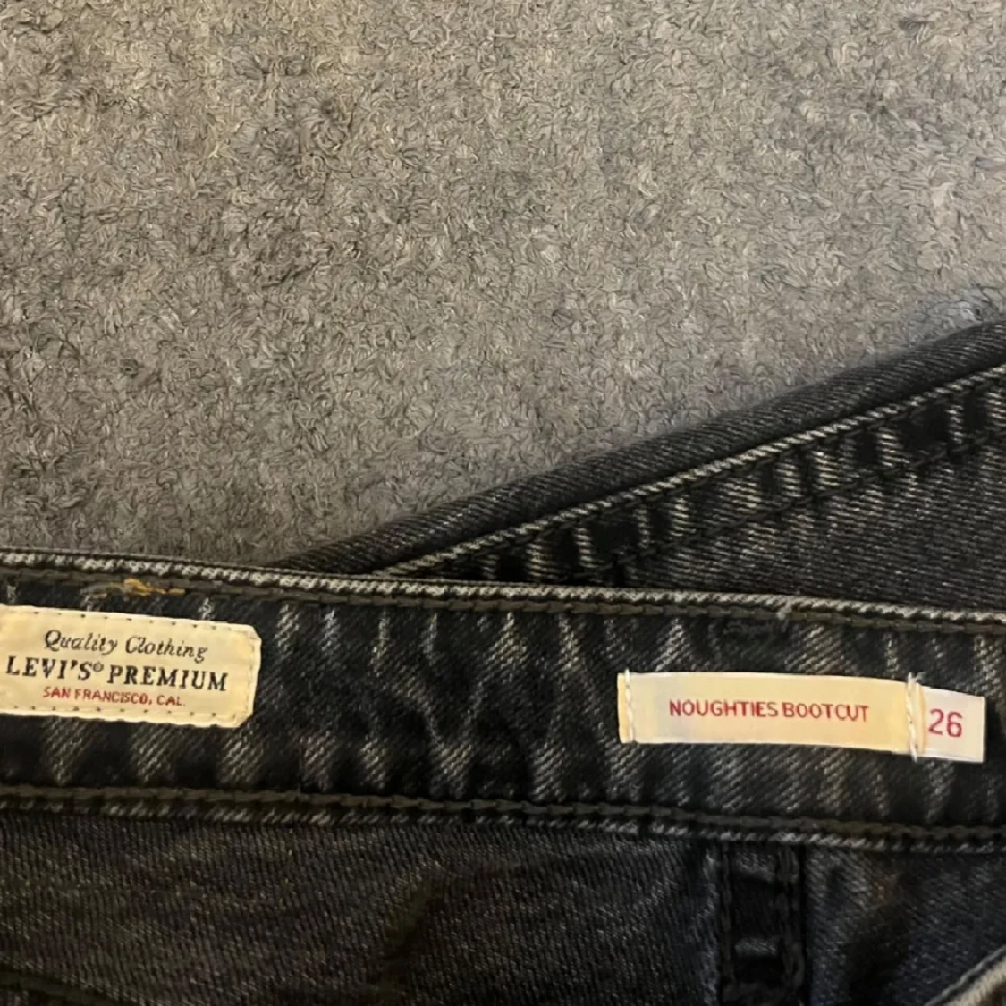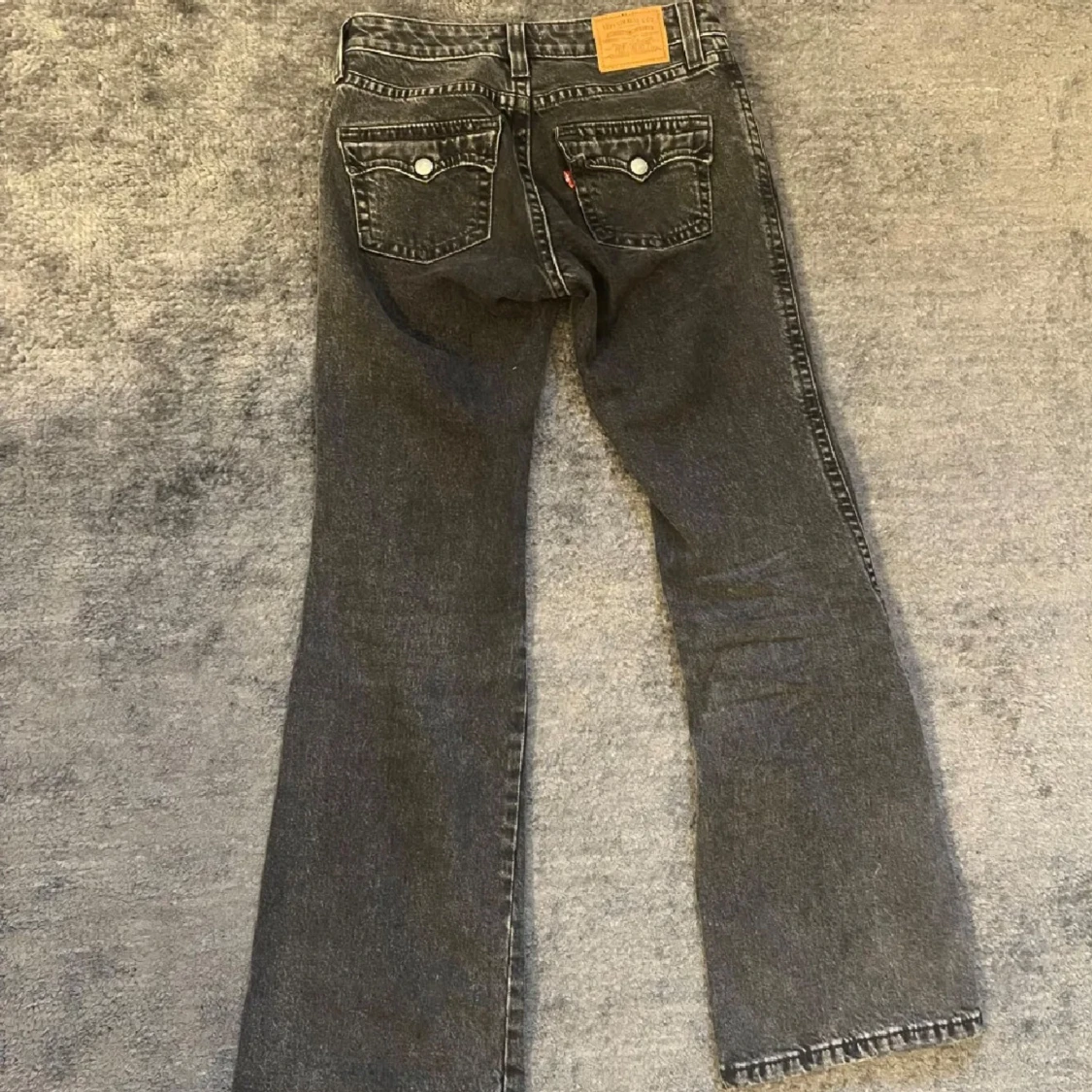 Säljer ett par svarta Levis jeans med bootcut passform. Jeansen har klassiska fem fickor, silverfärgade knappar och Levis läderpatch bak. Materialet är robust denim i bomull och färgen är snyggt tvättad svart. Perfekta för en cool och avslappnad stil.