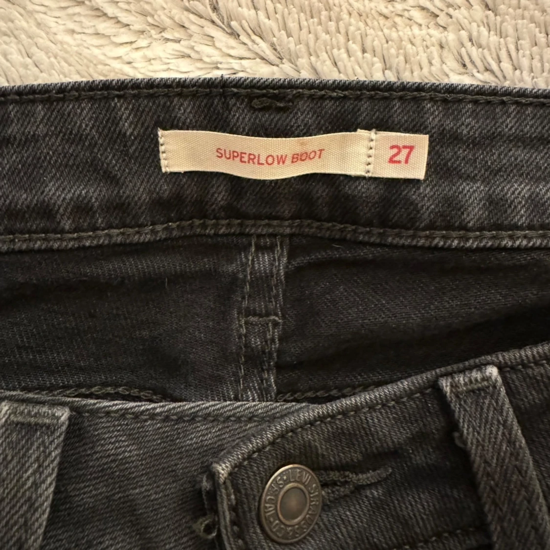 Lågmidjade svart/grå Levis jeans i modellen ”superlow boot” Strl W27 L30 och använda en gång!! (nypris 999:-) priset kan diskuteras