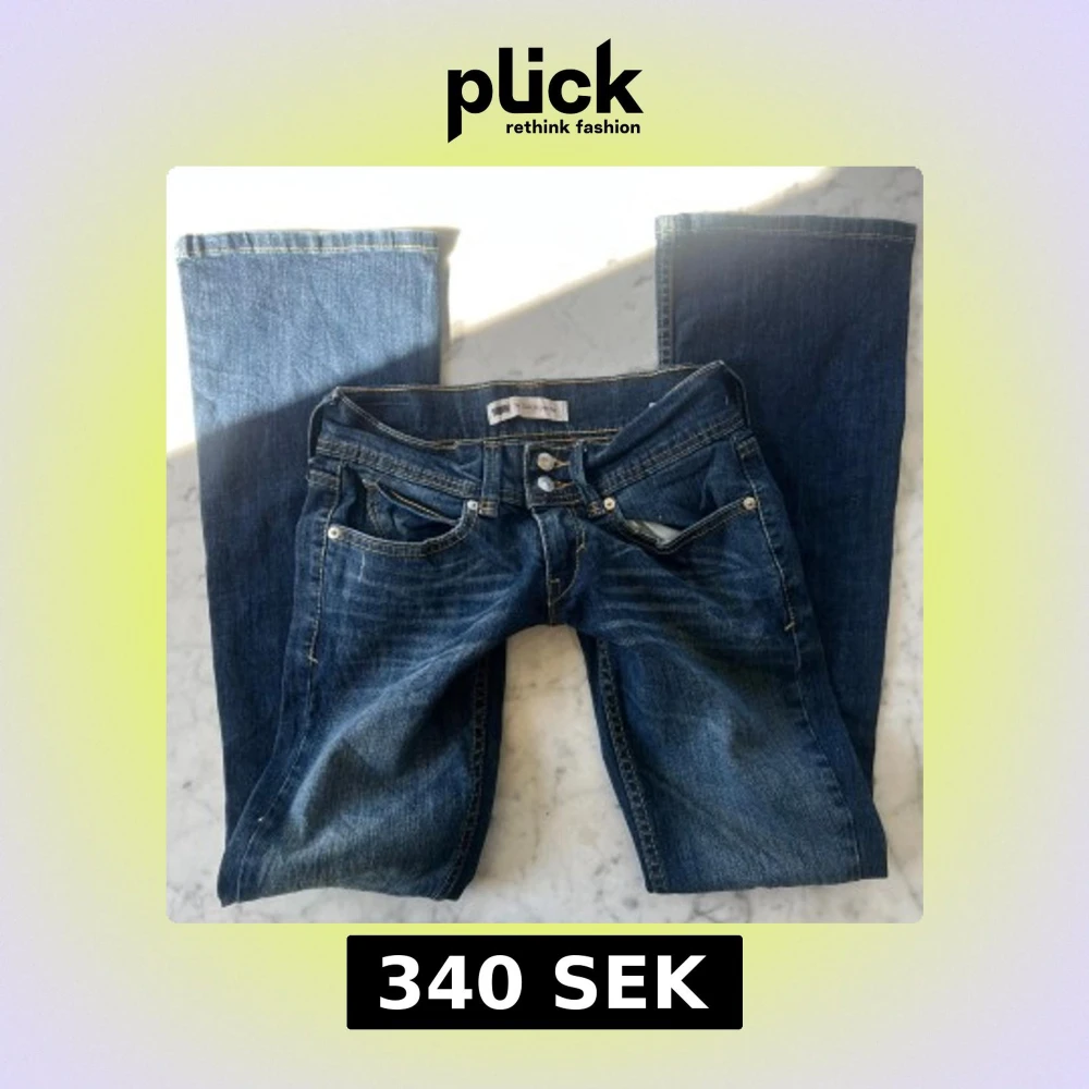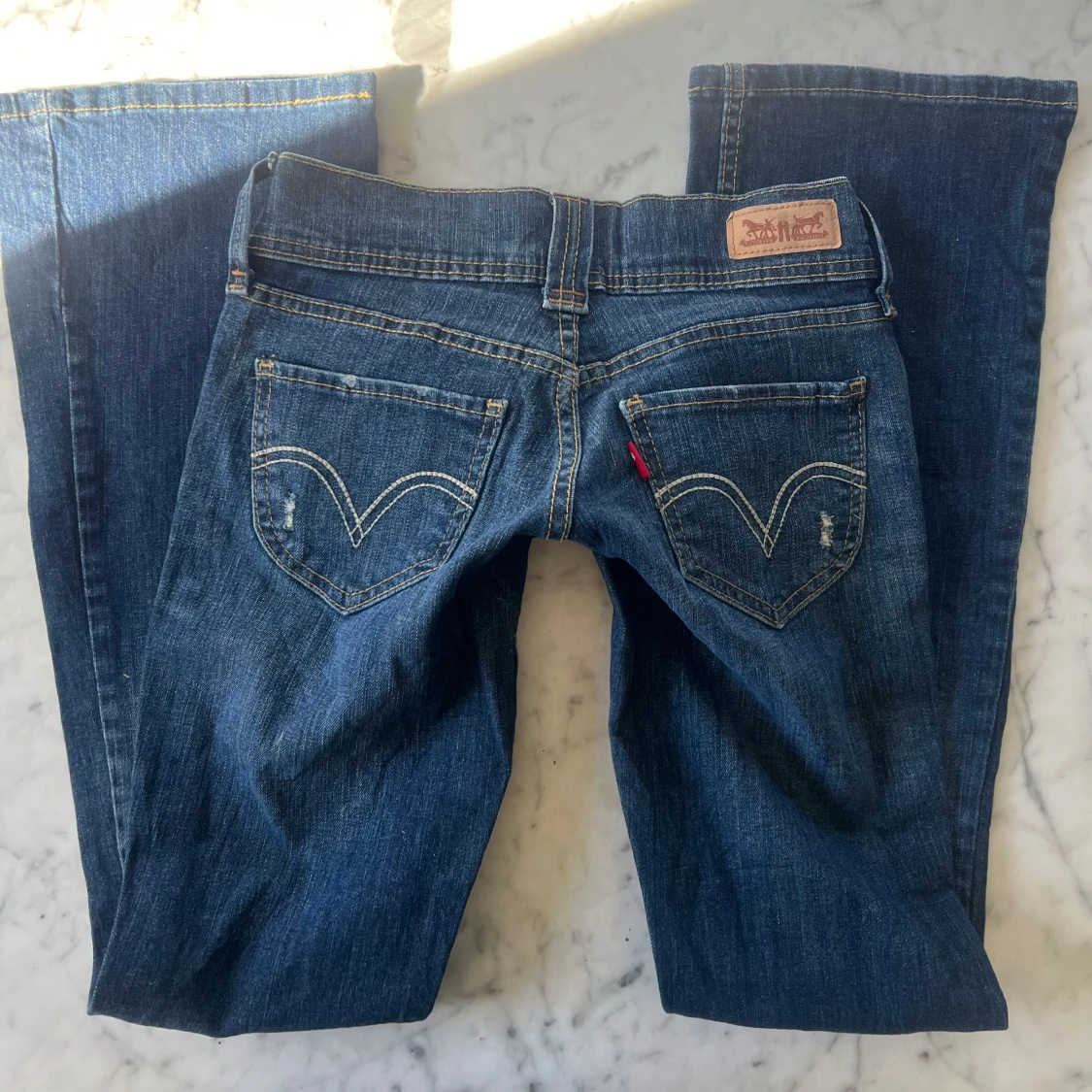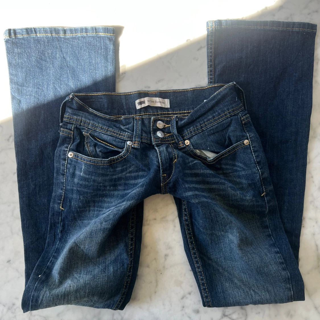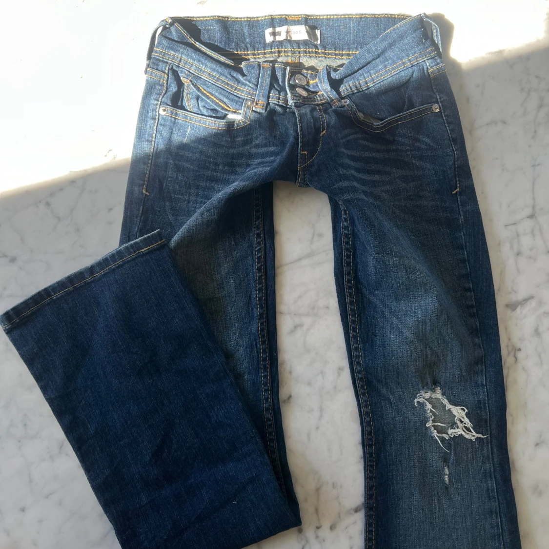 Skitsnygga lowwaist jeans i mörkblått. Har ett snyggt hål på knät. Innerbenslängd 76 cm, midjemått 64 cm. Tyvärr är de för små för mig därav ingen bild på 🫶🏼