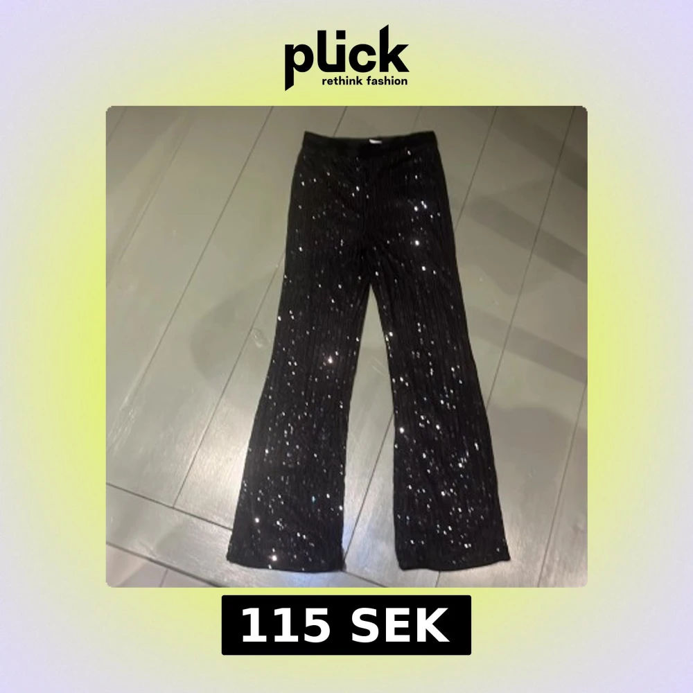 Glittriga svarta byxor från Lindex med paljetter över hela ytan. Byxorna har rak passform och elastisk midja för skön känsla. Perfekta för dig som vill sticka ut med lite extra bling och cool vibe. Passar dig som gillar att synas och vill ha något unikt i garderoben☺️