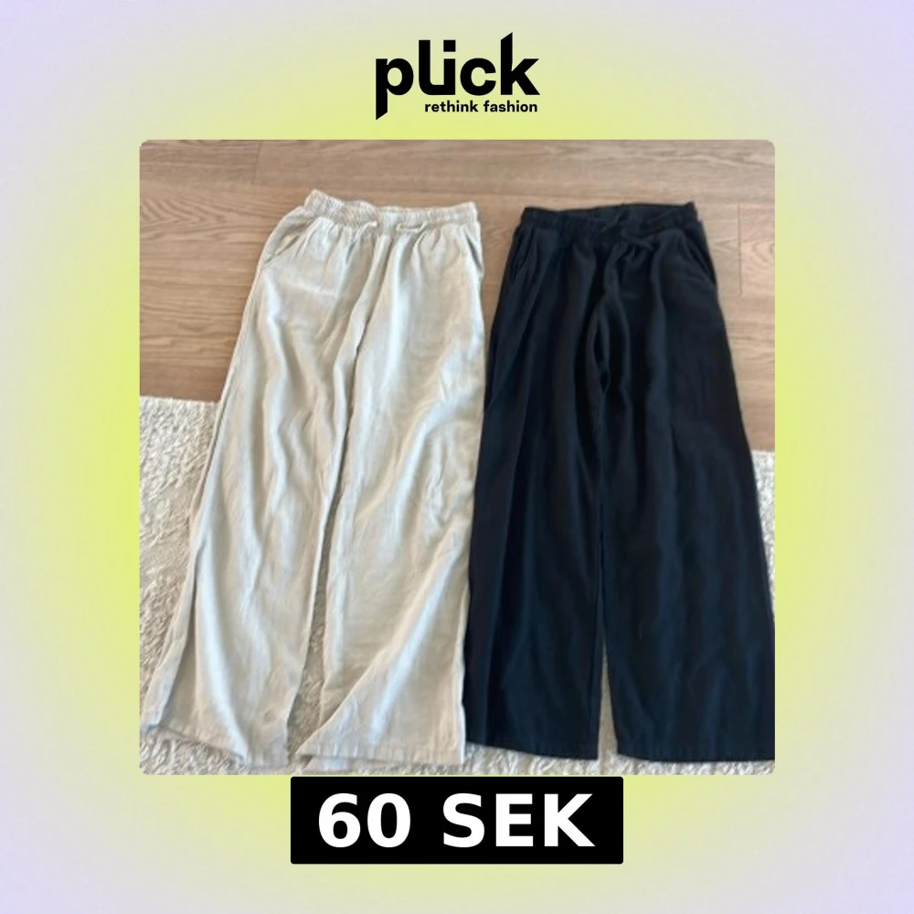 Två par sköna och luftiga linnebyxor från Lindex, ett par i beige och ett par i svart. Båda har resår i midjan och vida ben för en chill och avslappnad look. Perfekta för varma dagar eller när du vill ha det bekvämt.