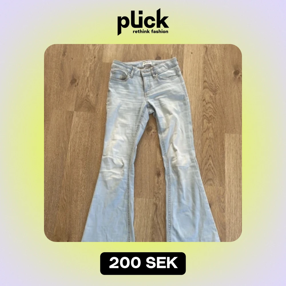 Ett par ljusblå jeansbyxor med bootcut-stil. Byxorna har inga hål eller fläckar. Knappt använda. väldigt fint skick. säljer då dem inte passar mig längre tyvärr. och inte kommer till användning