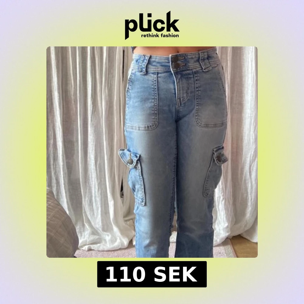 Säljer ett par ljusblå cargojeans från Lindex Freja med stora fickor på benen och snygga sömdetaljer. Jeansen har hög midja, raka ben och stängs med dubbla knappar. Perfekta för en chill och trendig look. ✨💞✨