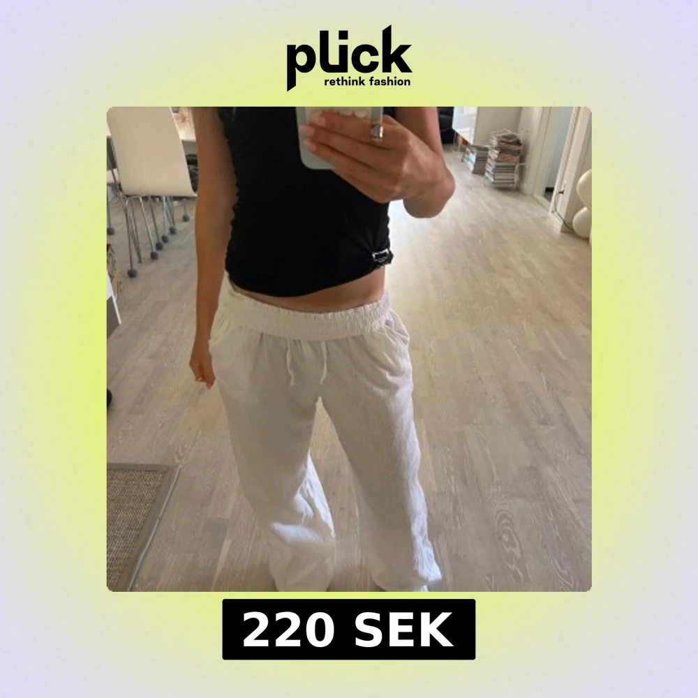 Säljer ett par vita linnebyxor från Lindex med avslappnad passform och resår i midjan. Byxorna har snörning och raka ben, perfekta för en chill och luftig stil. Superbekväma och lätta att matcha med allt.