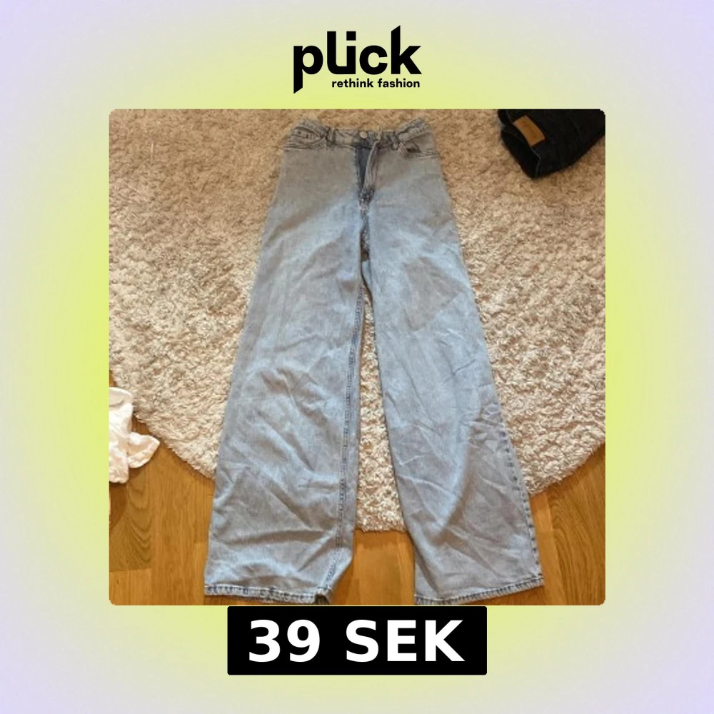 Säljer ett par ljusblå jeans från Lindex i storlek 152. Byxorna är lite baggy och är tillverkade i denim. De har en rak och vid passform som ger en avslappnad stil. De har en liten fläck