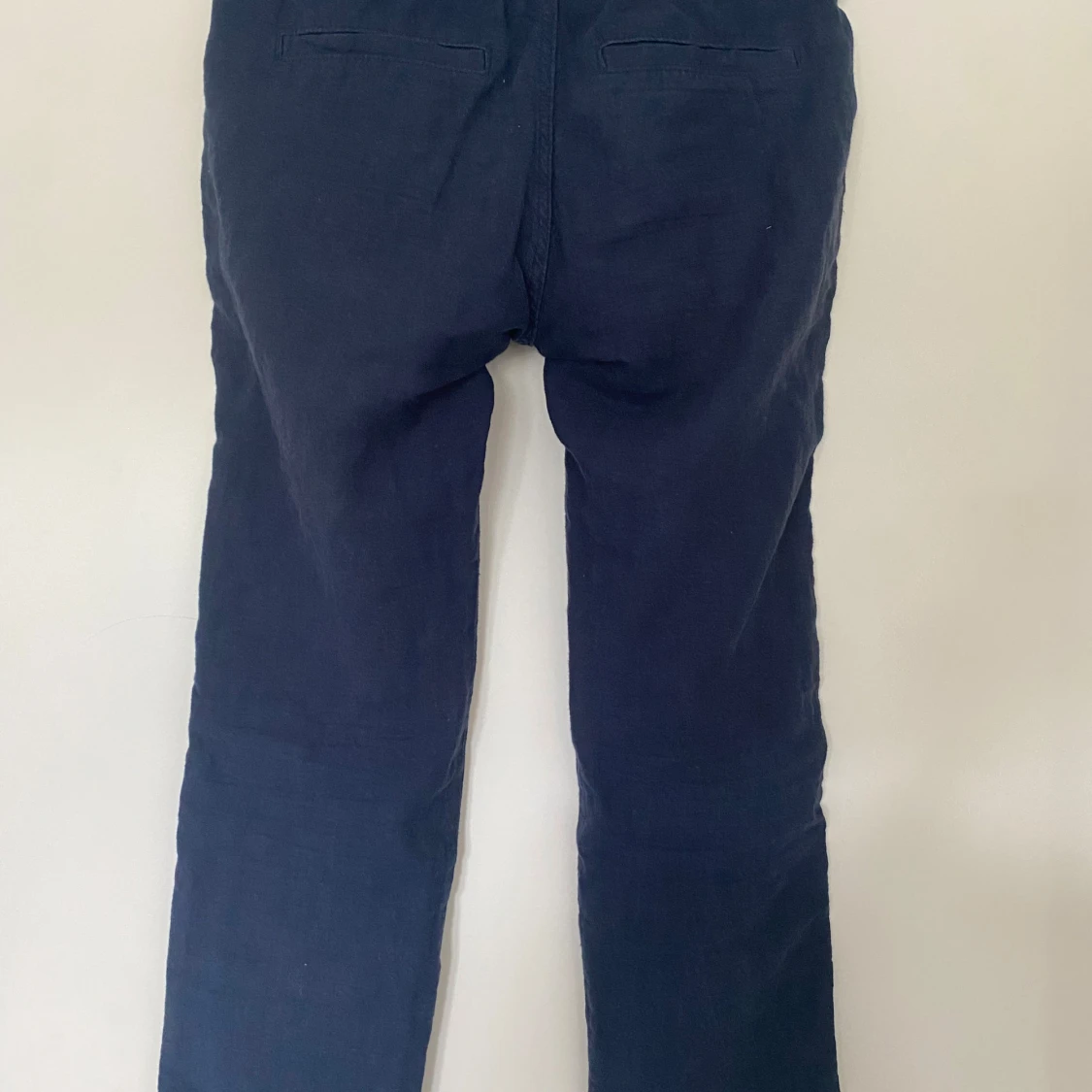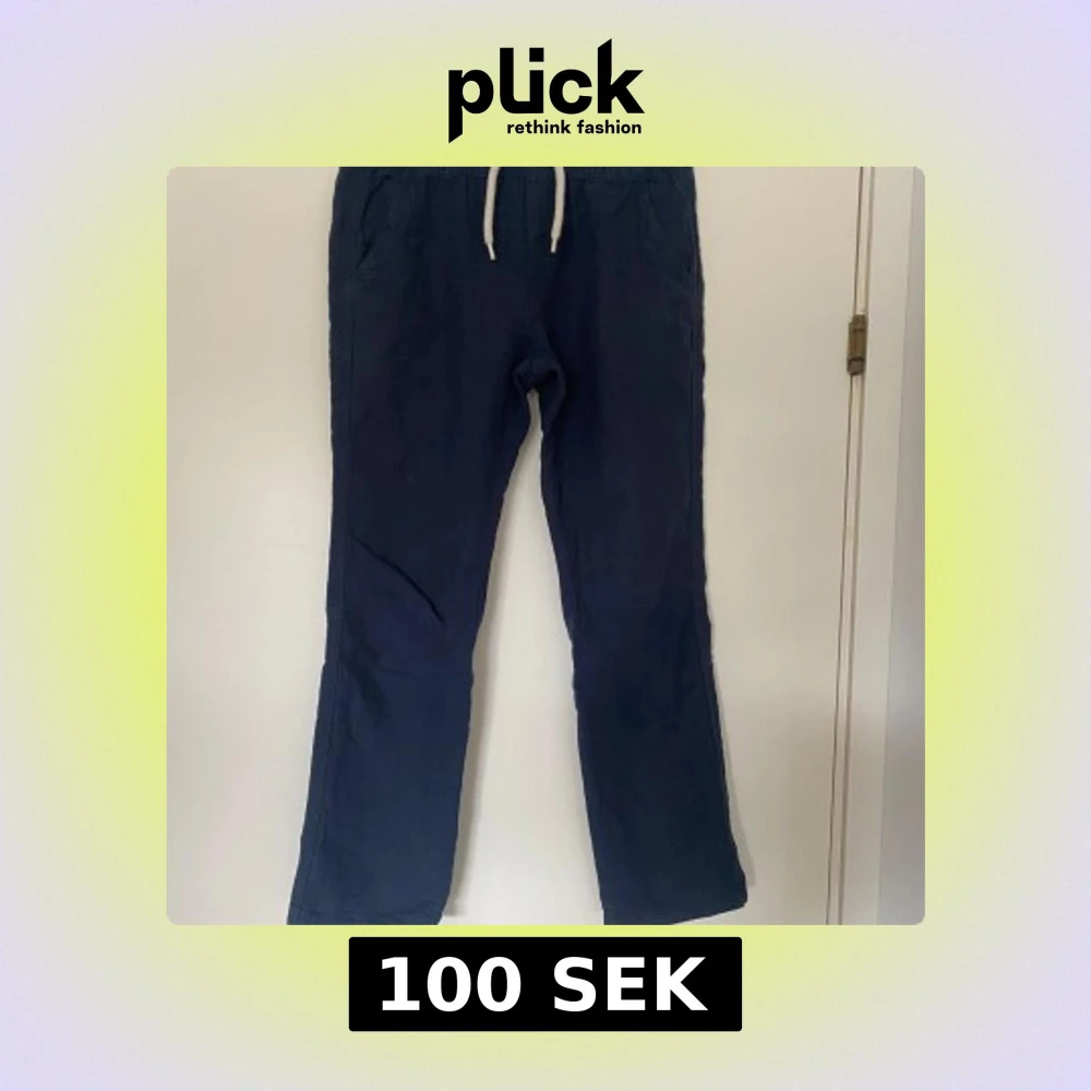 Mörkblå linnebyxor från Lindex med dragsko i midjan och raka ben. Byxorna har sidfickor fram och passpoalfickor bak. Perfekta för en chill och avslappnad stil, tillverkade i svalt linne.