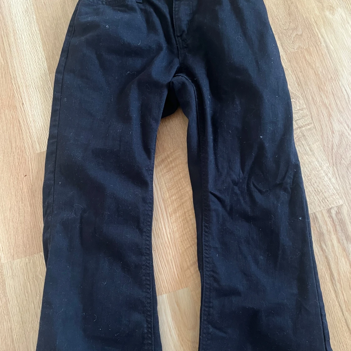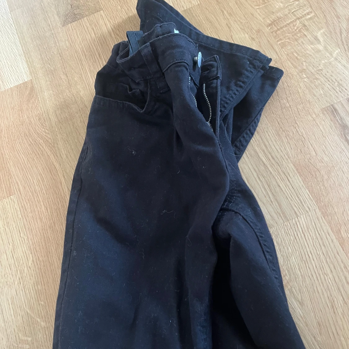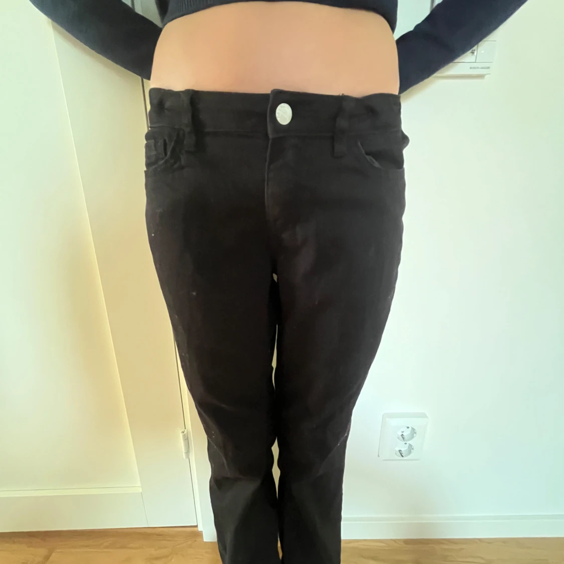 Säljer ett par svarta jeans med bootcut-snitt och midwaist. De har klassisk femficksdesign, knapp och dragkedja framtill samt bälteshällor. Materialet är jeans och färgen är helsvart, vilket gör dem enkla att matcha med olika stilar! Jag skulle säga att de upplevs som ”ballongiga” men går som man ser på bilden att fixa 🤭🥰 nästan oanvända!!