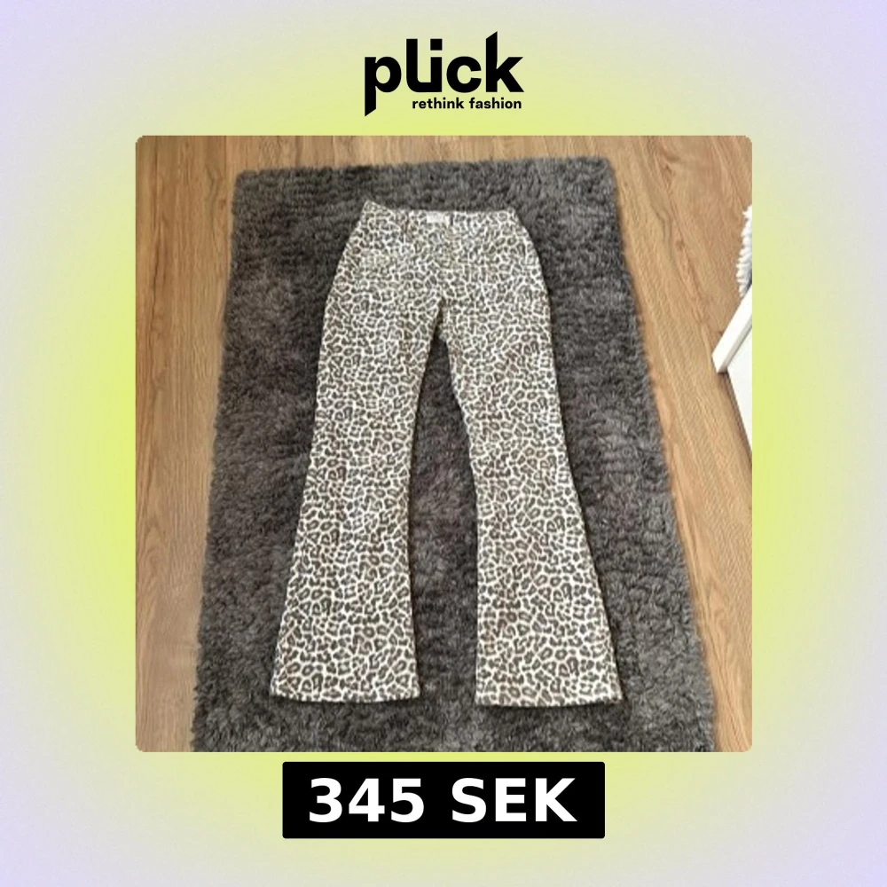 Säljer ett par snygga bootcut jeans utan fickor där bak men två fickor där fram med leopardmönster i beige och grå toner. Jeansen har en klassisk passform med utsvängda ben och midja. Perfekta för dig som vill sticka ut med ett djurmönster och cool siluett.