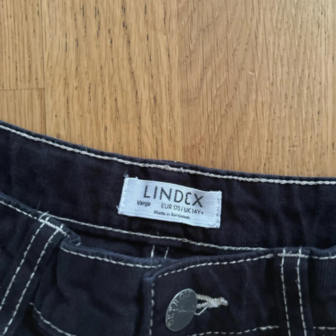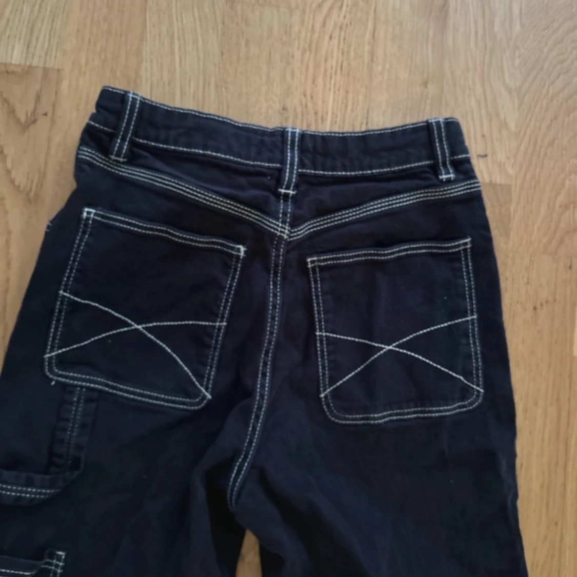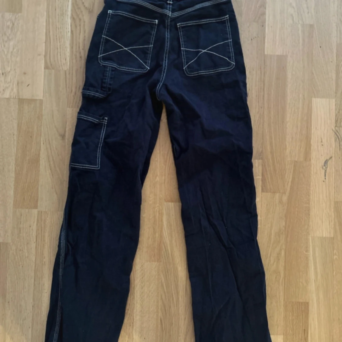 Svarta cargopants från Lindex med kontrasterande vita sömmar och flera fickor, inklusive bakfickor med dekorativa sömmar. Byxorna har rak passform och är tillverkade i bomull. Perfekta för en avslappnad och cool stil.