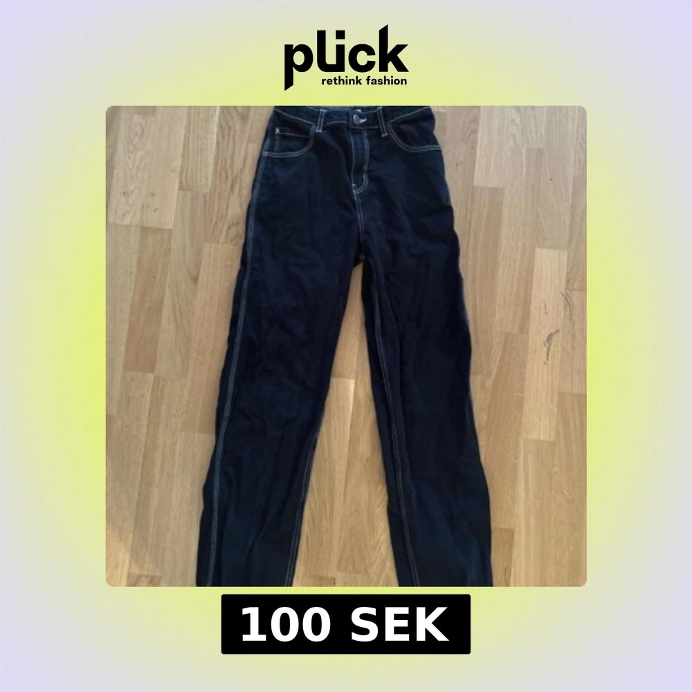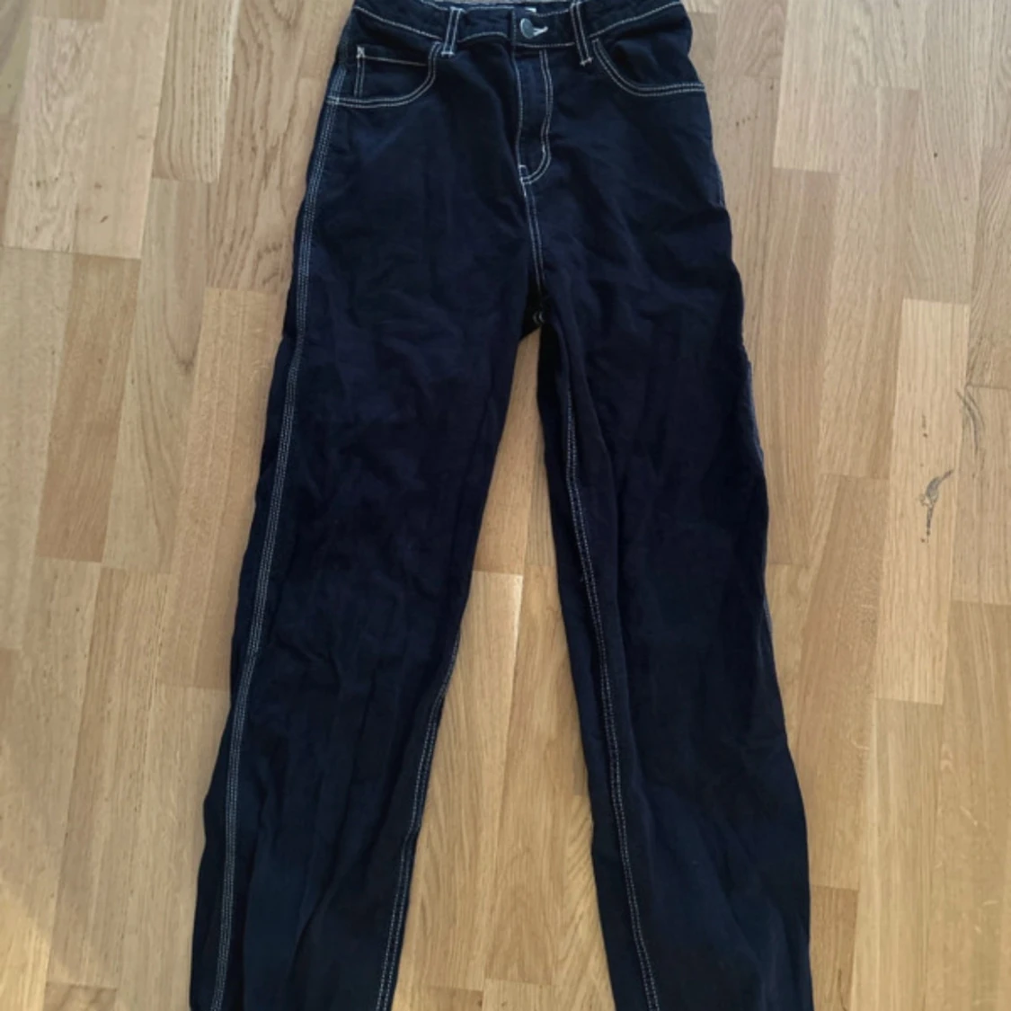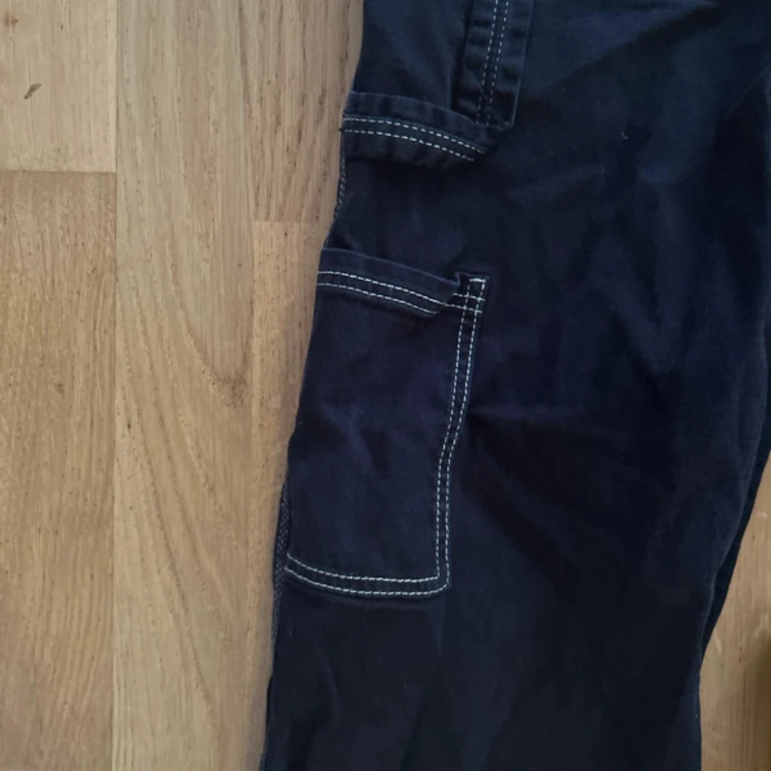 Svarta cargopants från Lindex med kontrasterande vita sömmar och flera fickor, inklusive bakfickor med dekorativa sömmar. Byxorna har rak passform och är tillverkade i bomull. Perfekta för en avslappnad och cool stil.
