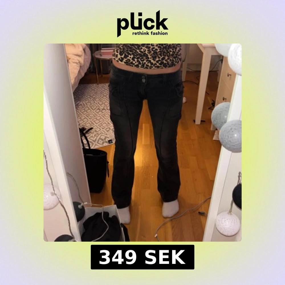 Snygga svarta bootcut jeans med mid midja. Perfekta för en trendig stil, De har en unik design med knappar och fickor p sidan❤️ ny pris:650kr