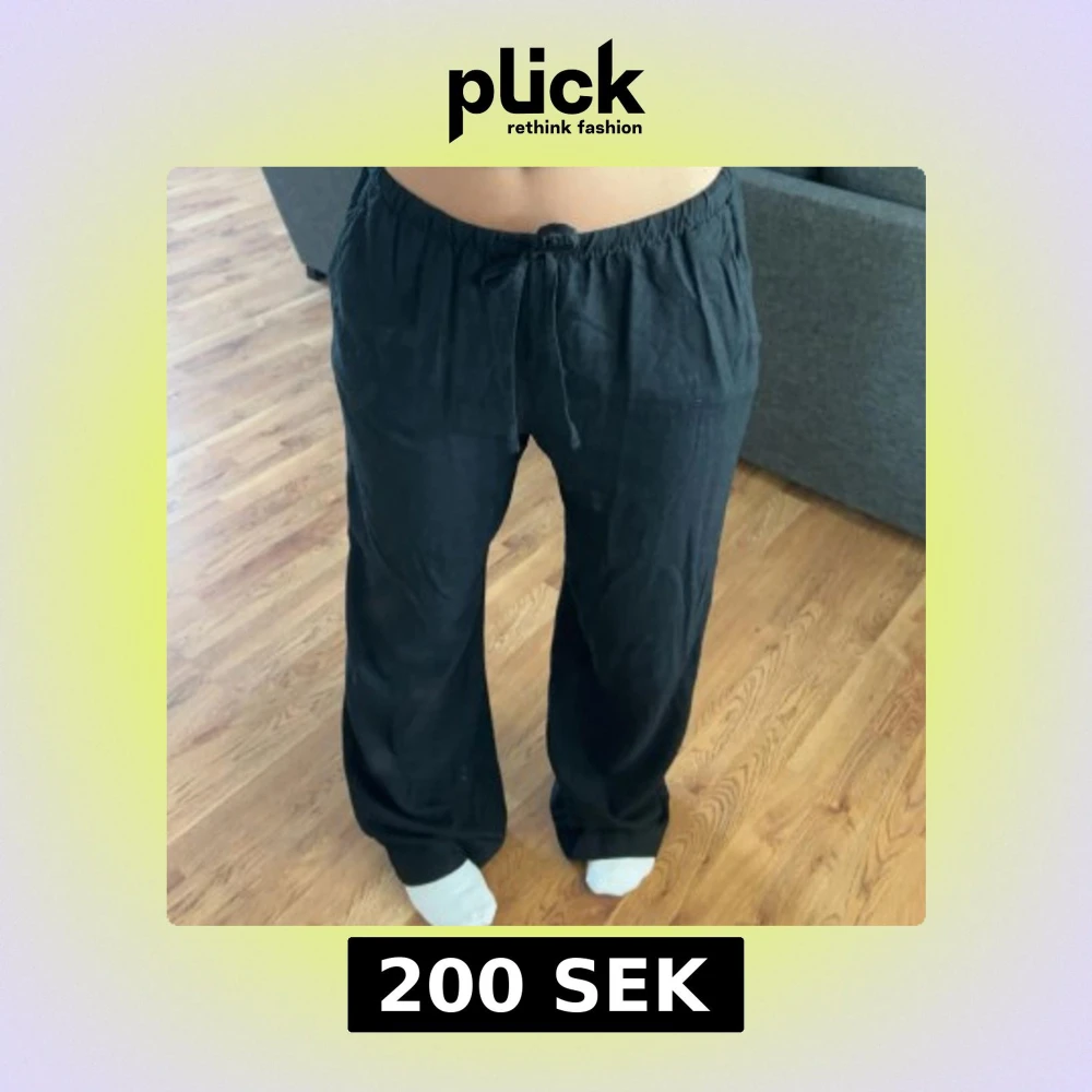 Säljer ett par svarta linnebyxor med bred passform och dragsko i midjan. Byxorna har hög midja och är riktigt sköna och luftiga, perfekta för chill dagar. Materialet är linne och de har en loose fit som ger en avslappnad vibe. Använt 1 gång!