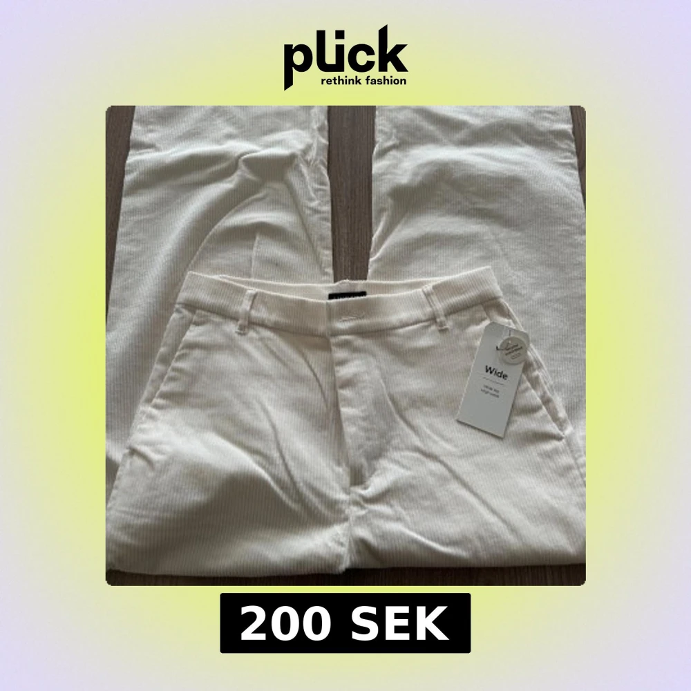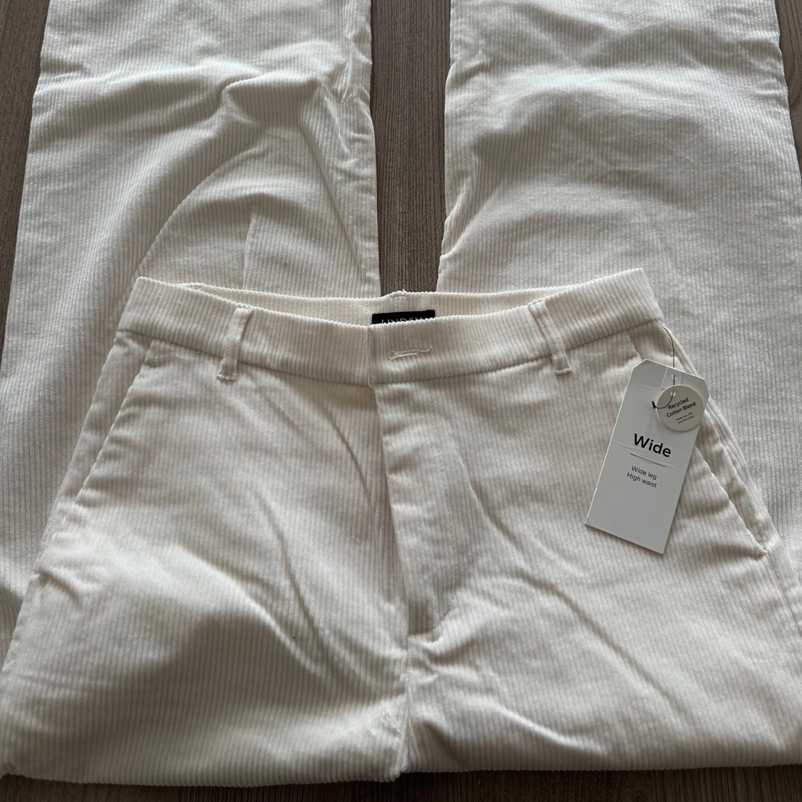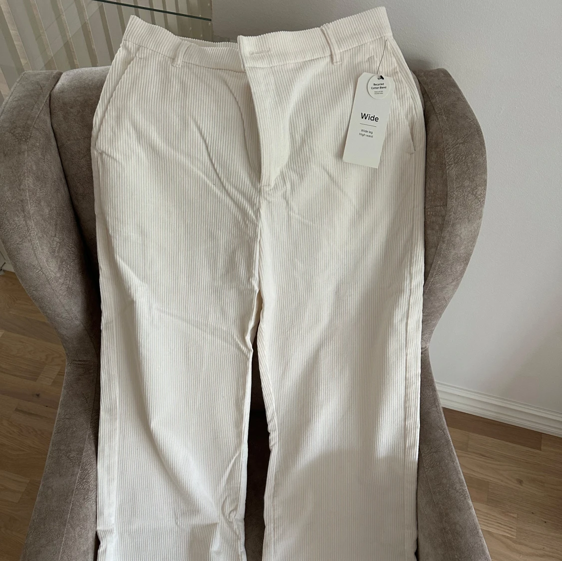 Säljer ett par vita vida byxor i manchester med diskreta ränder. Byxorna har hällor för bälte och sidofickor. Perfekta för dig som gillar en avslappnad och trendig stil, de är också helt nya och oanvända , säljer de eftersom de är för stora.