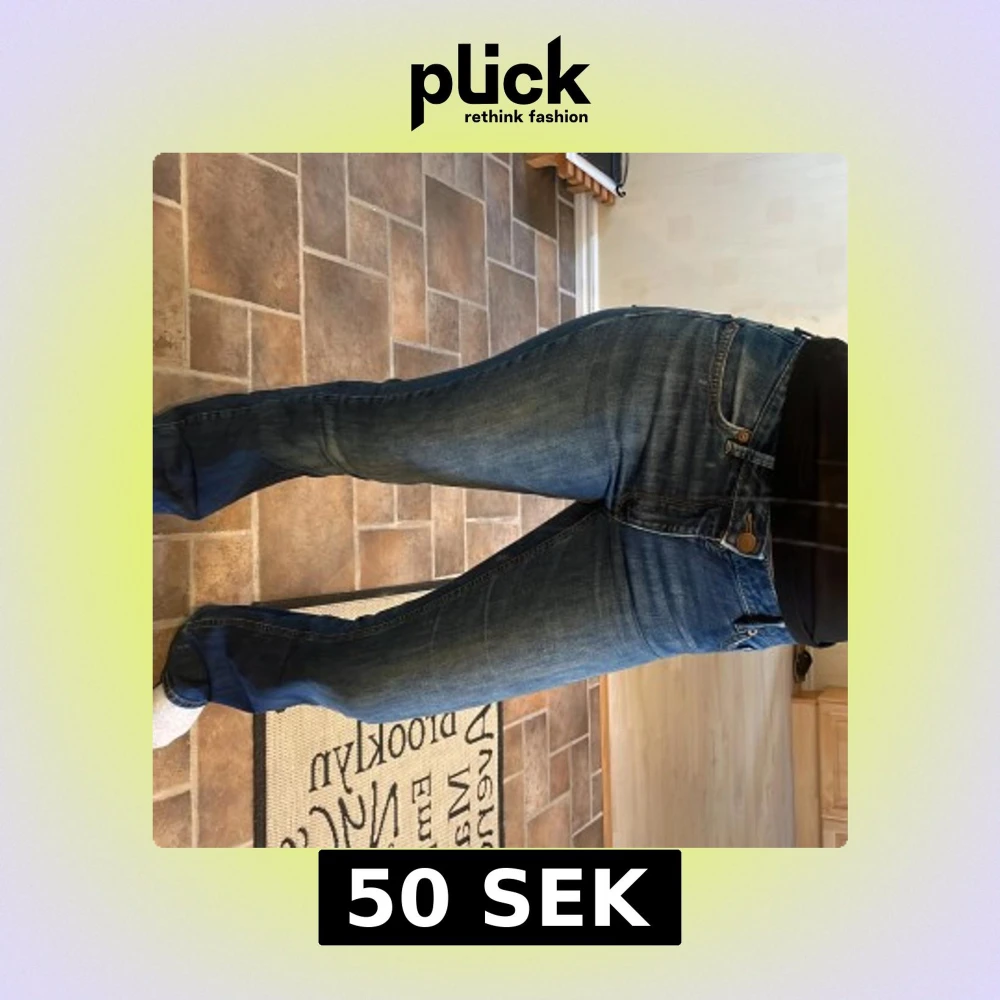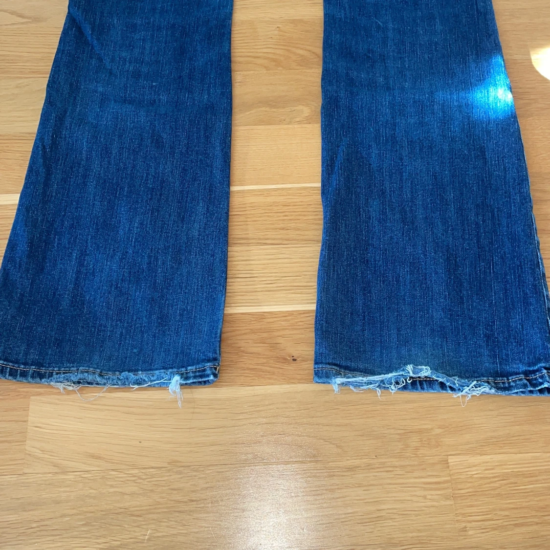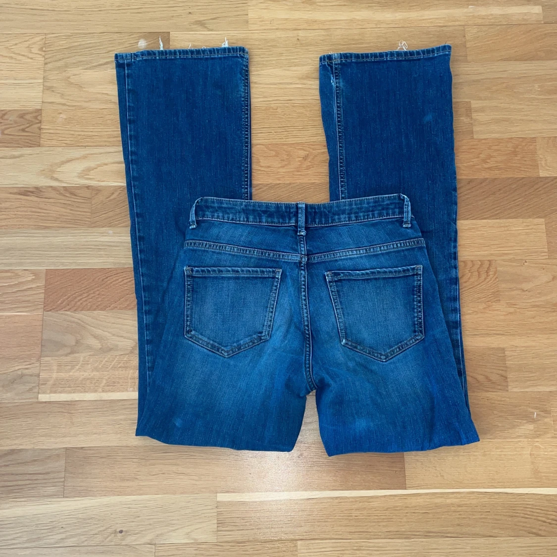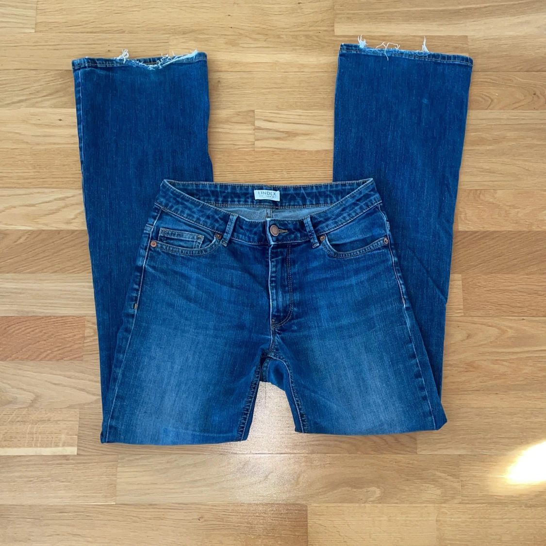 Mörkblåa bootcut jeans från Lindex med normal midjehöjd. De är ganska slitna vid bensluten, annars i gott skick! 😋💓Passar även strl 36.