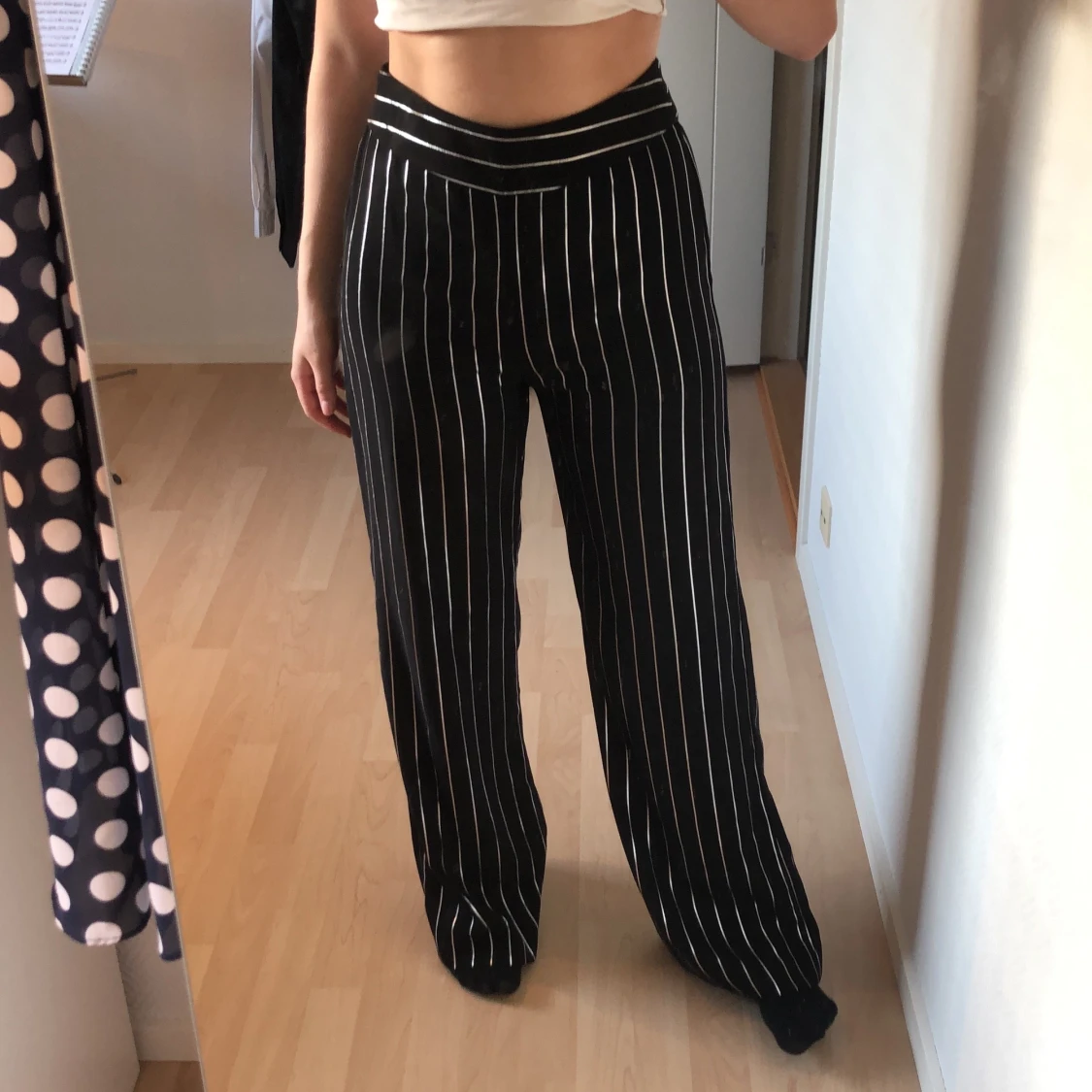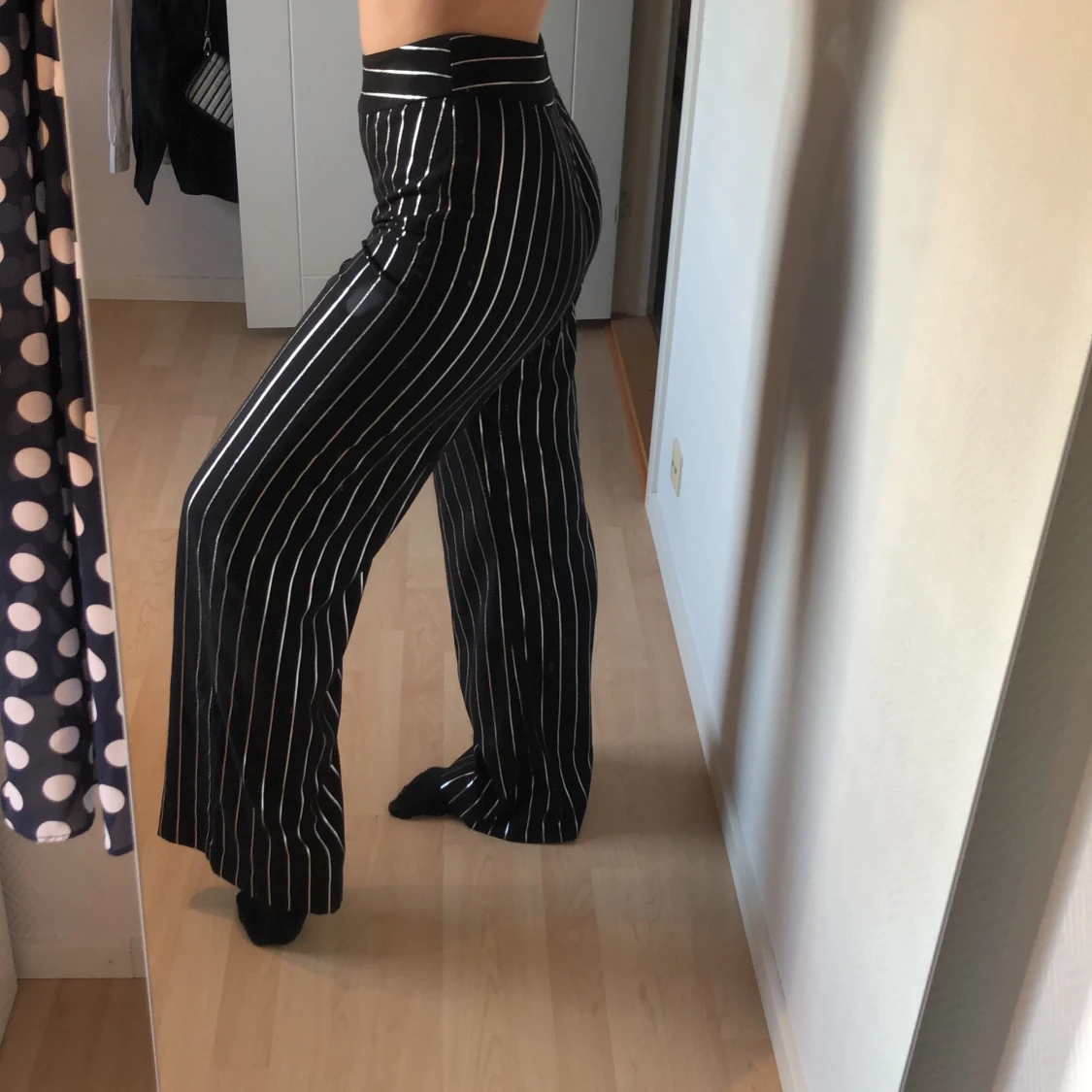Svinsnygga och sköna byxor! Tyvärr för långa för mig 😭. Silverglittriga smala ränder så man glittrar om man står i blixt ⚡️ storlek 36 men passar nog 38 också. 100kr exkl frakt!