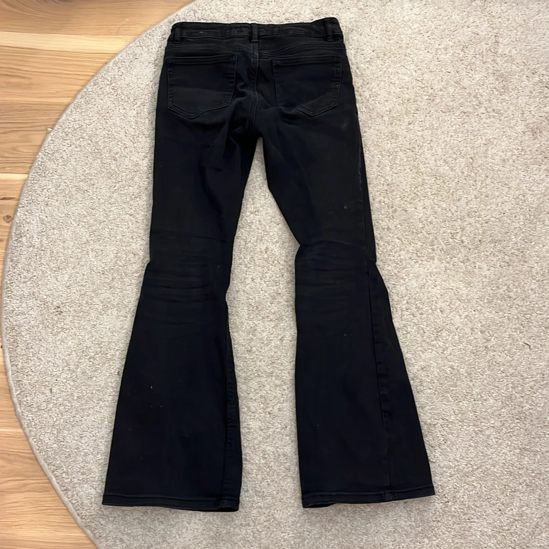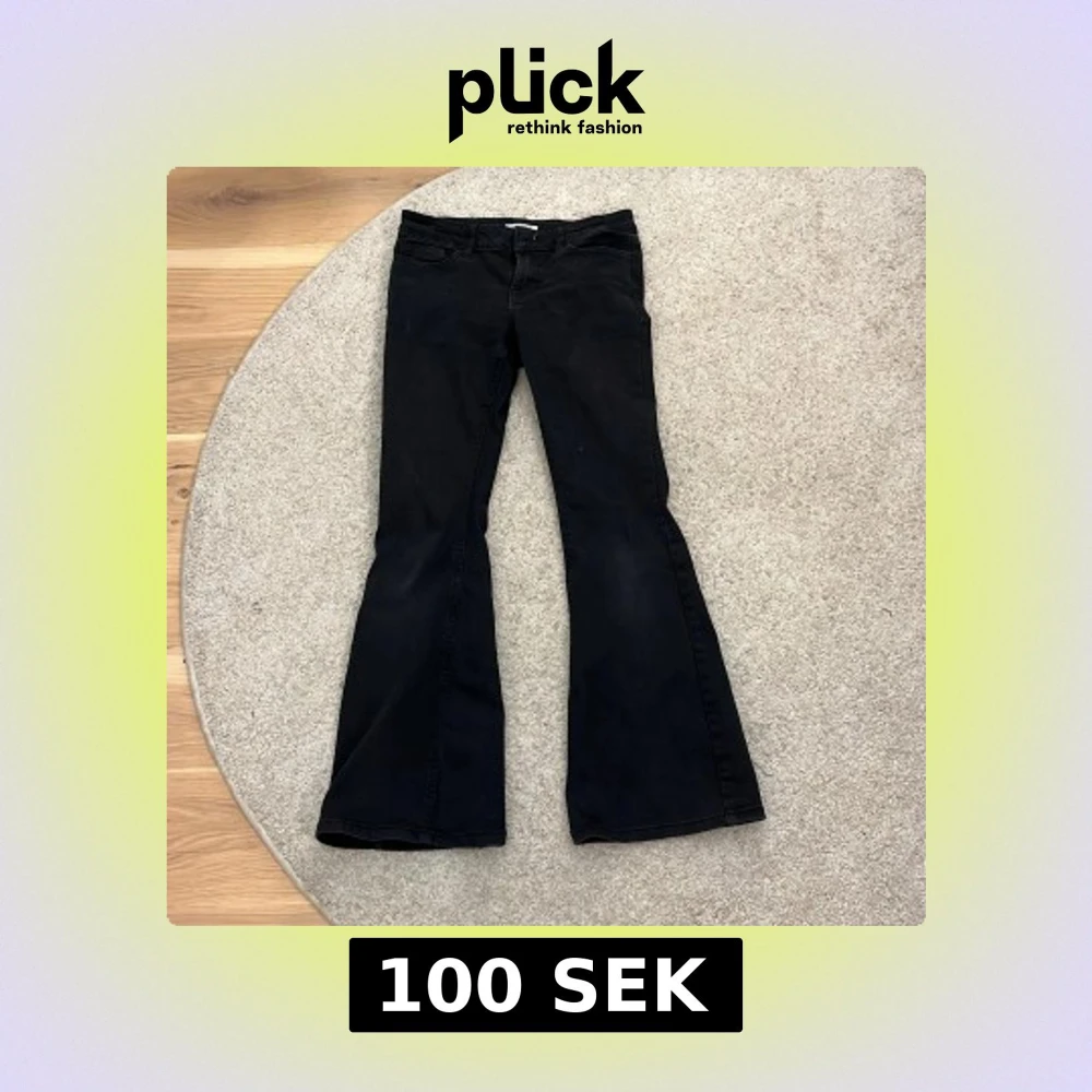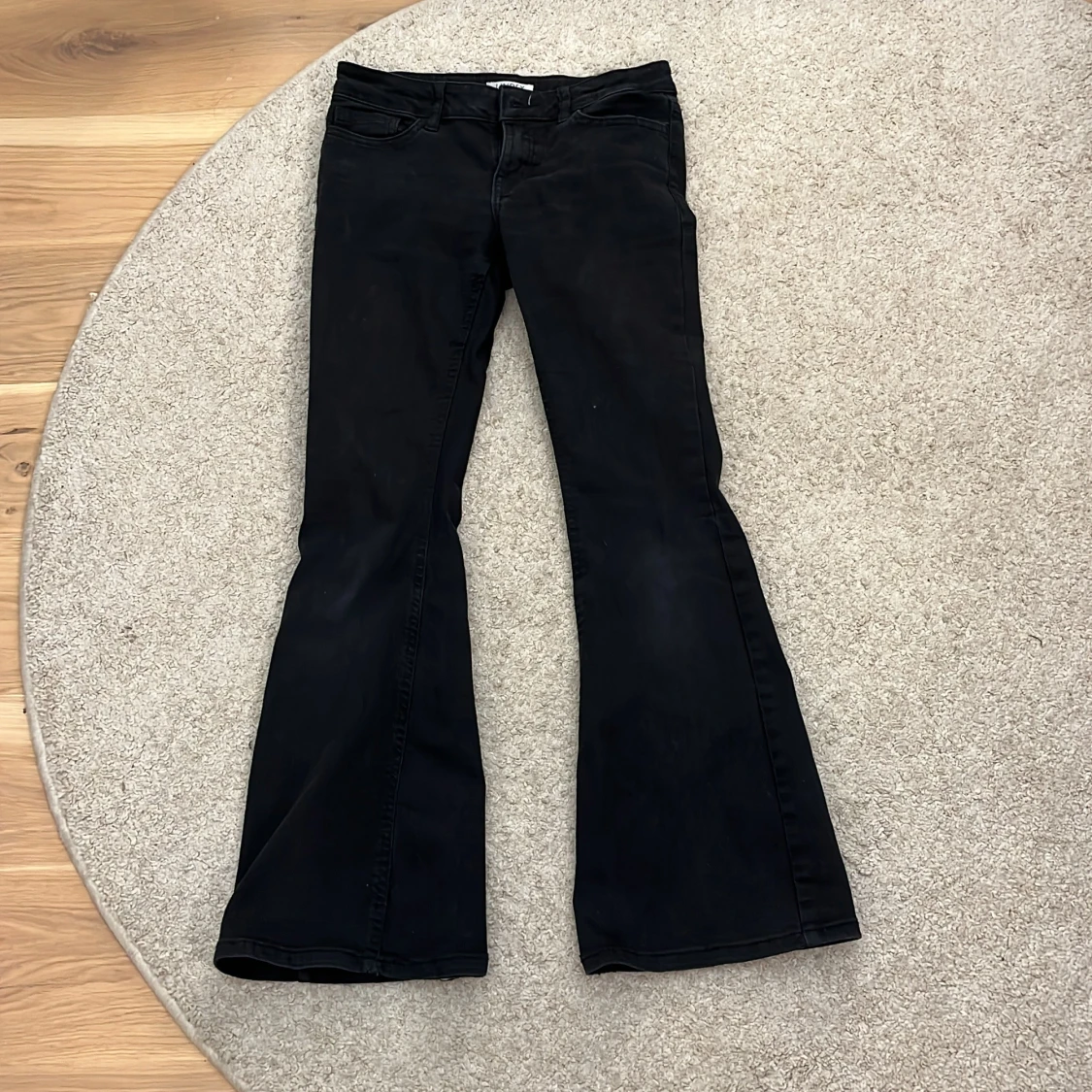 Säljer ett par svarta bootcut jeans med lågmidja klassisk femficksdesign. Byxorna har utsvängda ben och normal passform upptill. Perfekta för dig som gillar en retrostil med moderna vibbar.