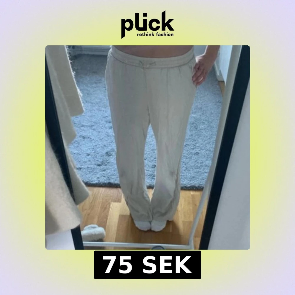 Säljer ett par beiga linnebyxor med avslappnad passform och resår i midjan. Byxorna har raka ben och är perfekta för varmare dagar. Enkla att matcha med olika toppar för en chill look.