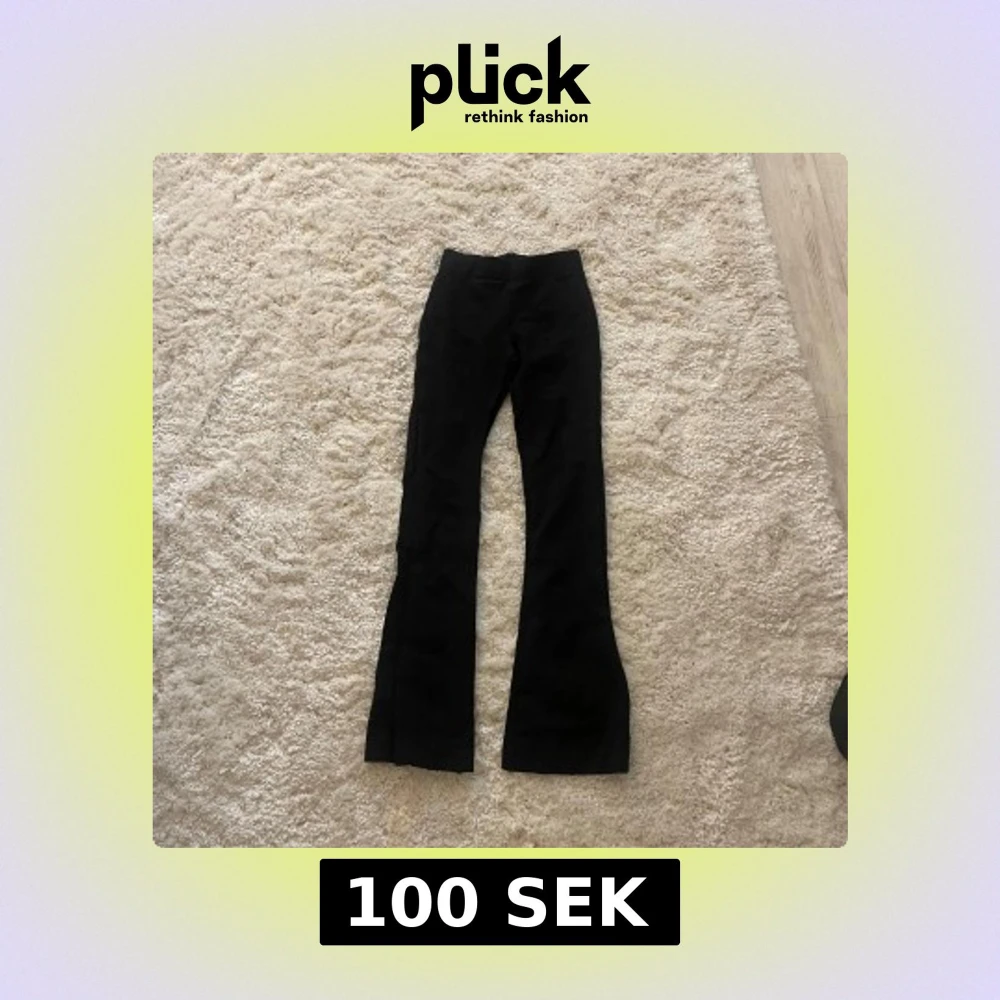 Säljer ett par svarta bootcut kostymliknande byxor med hög midja. De har en snygg utsvängd passform och är perfekta för dig som gillar en stilren look❣️ OBS! Lappen är bort klippt!