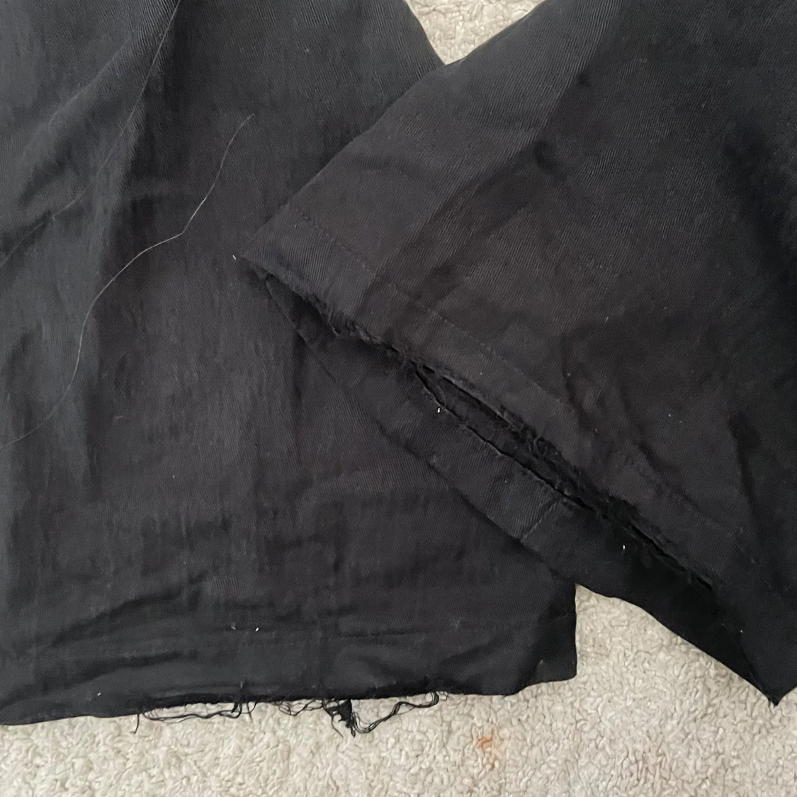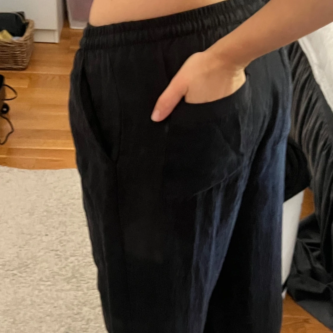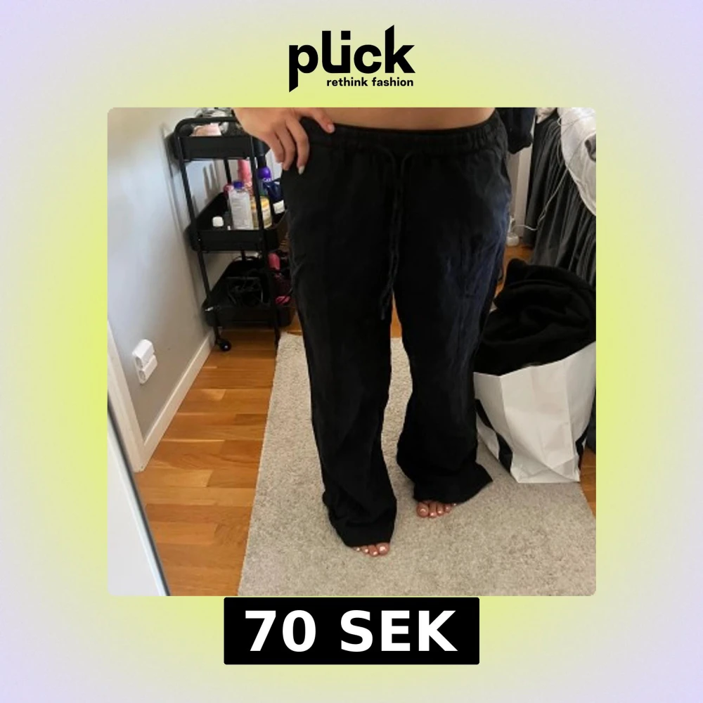 Säljer mina svarta linnebyxor från Zara med snöre i midjan och fickor där bak!! Lite slitage längst ner men det är inget som är super synligt!!
