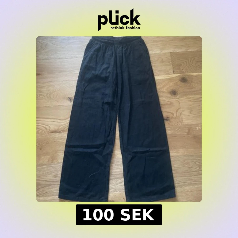 Säljer ett par svarta linnebyxor med breda ben och elastisk midja. Byxorna har en avslappnad passform och är perfekta för varma dagar. Stilrena och enkla att matcha med olika toppar.