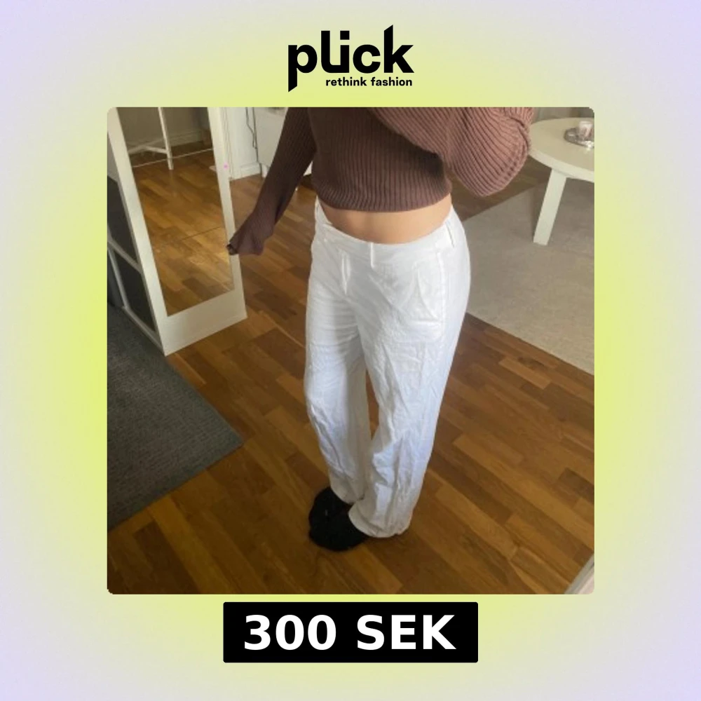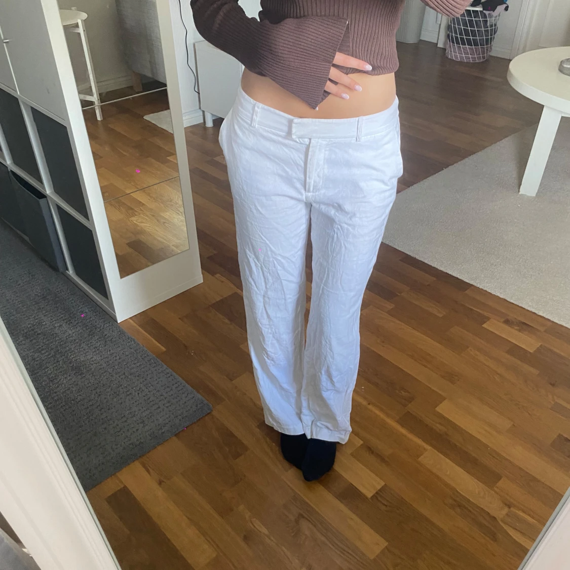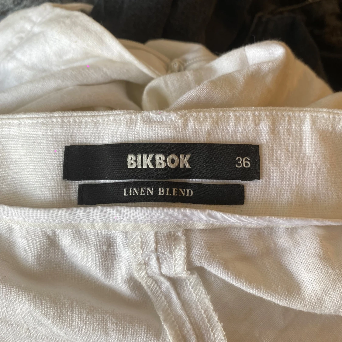 Säljer ett par fräscha vita linnebyxor från BikBok i storlek 36. Byxorna har raka ben, normal passform och är tillverkade i en skön linneblandning. Perfekta för varmare dagar