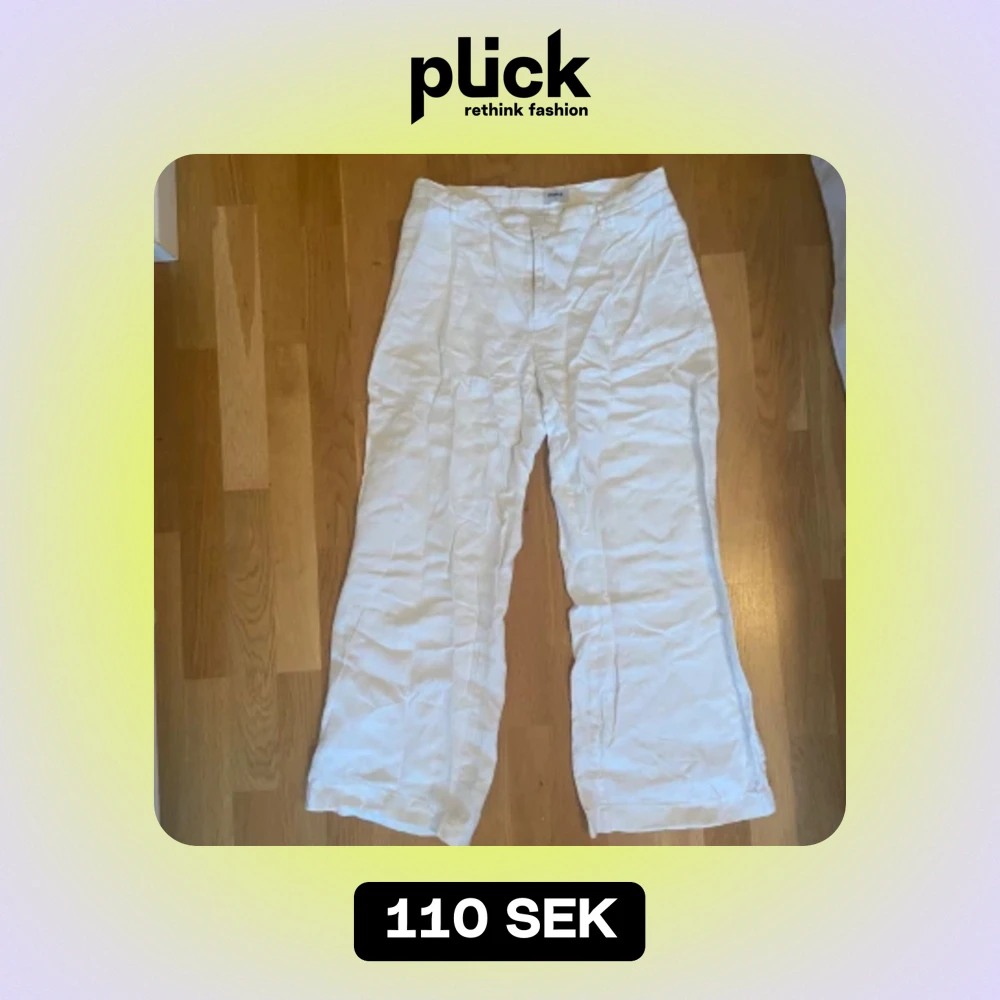 Vita raka linnebyxor med låg midja Midjemått: ca 75 cm Innerbenslängd: ca 65 cm (Personen på bilden är ca 160 cm) Ett litet hål på baksidan, se bild