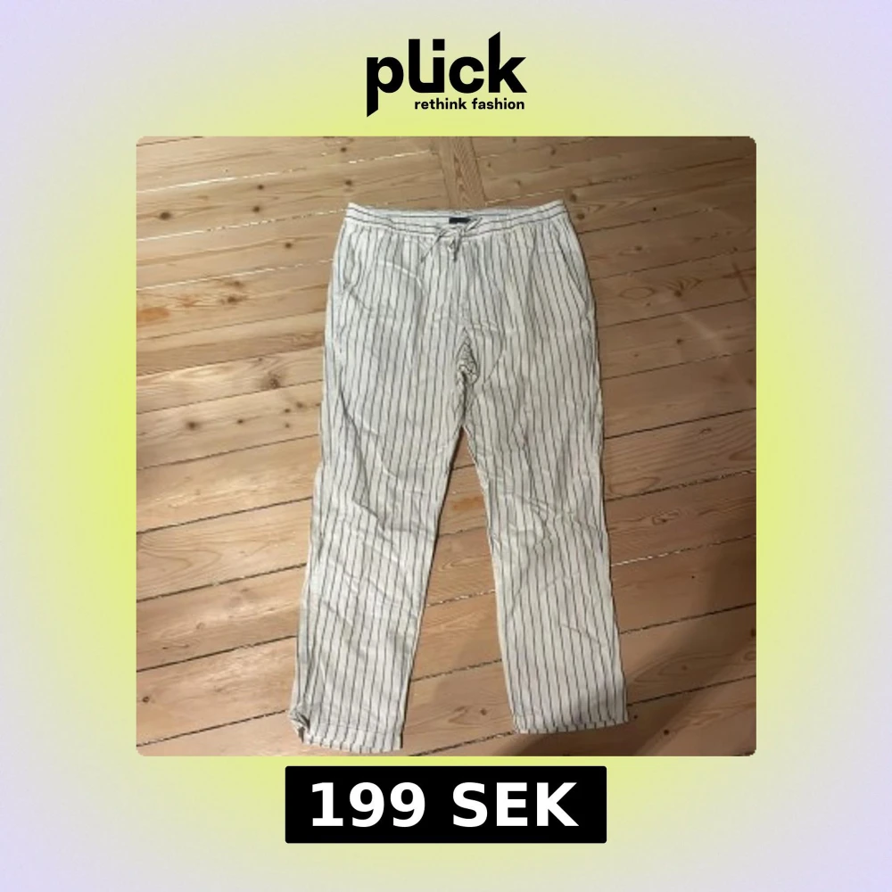 Säljer ett par bekväma och stilrena randiga byxor från H&M i storlek M. Byxorna har en midwaist passform och ger en lite fransk vibe. De är vita med svarta ränder och har en snörning i midjan för justerbar passform. De har blivit lite för små för mig och säljer nu dom. De är helt i nyskick.