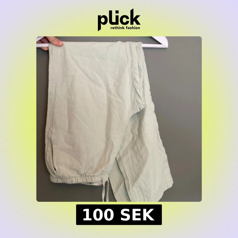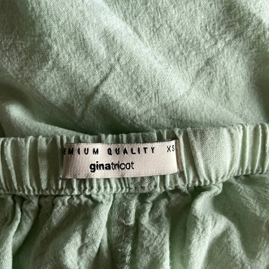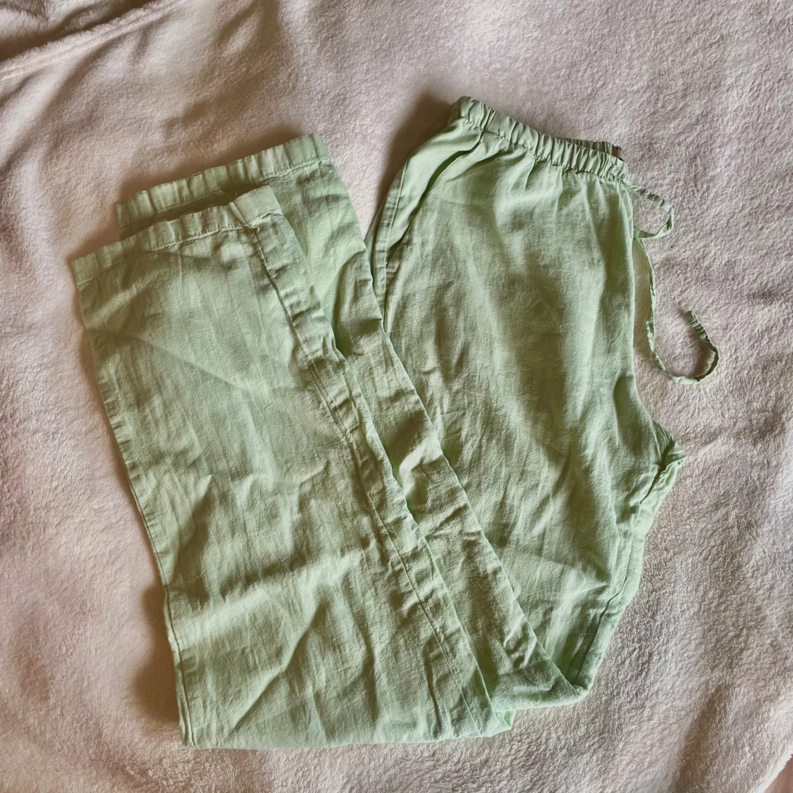 Snygga ljusgröna linnebyxor från Gina Tricot i storlek XS. Byxorna har resår och snörning i midjan för skön passform. Raka ben och är i regular längd, passar bra till mig som är 170cm 💚