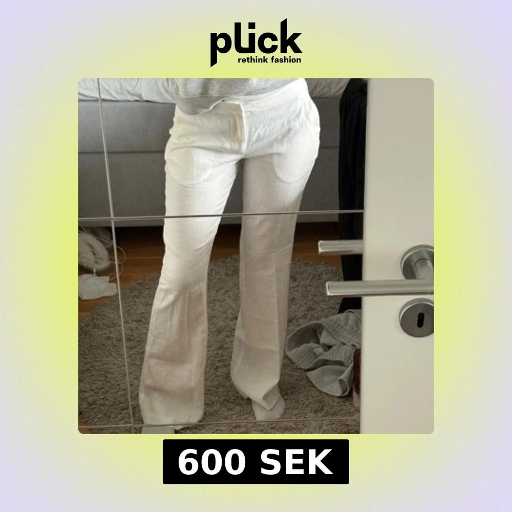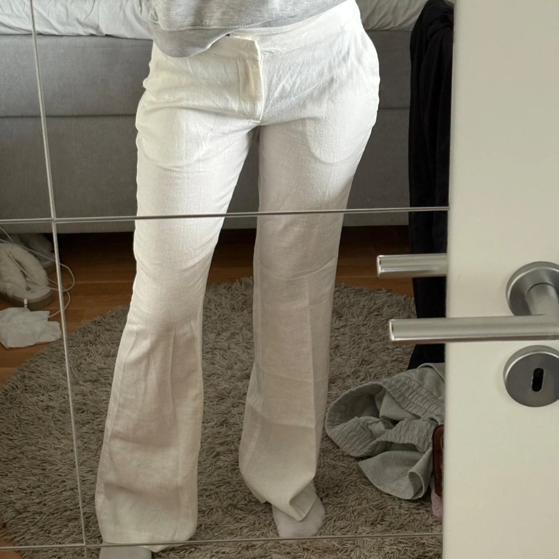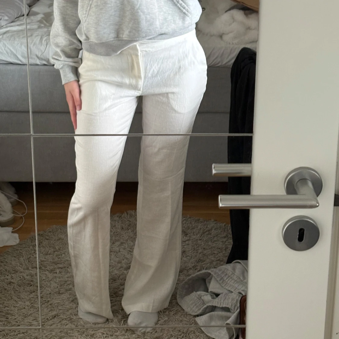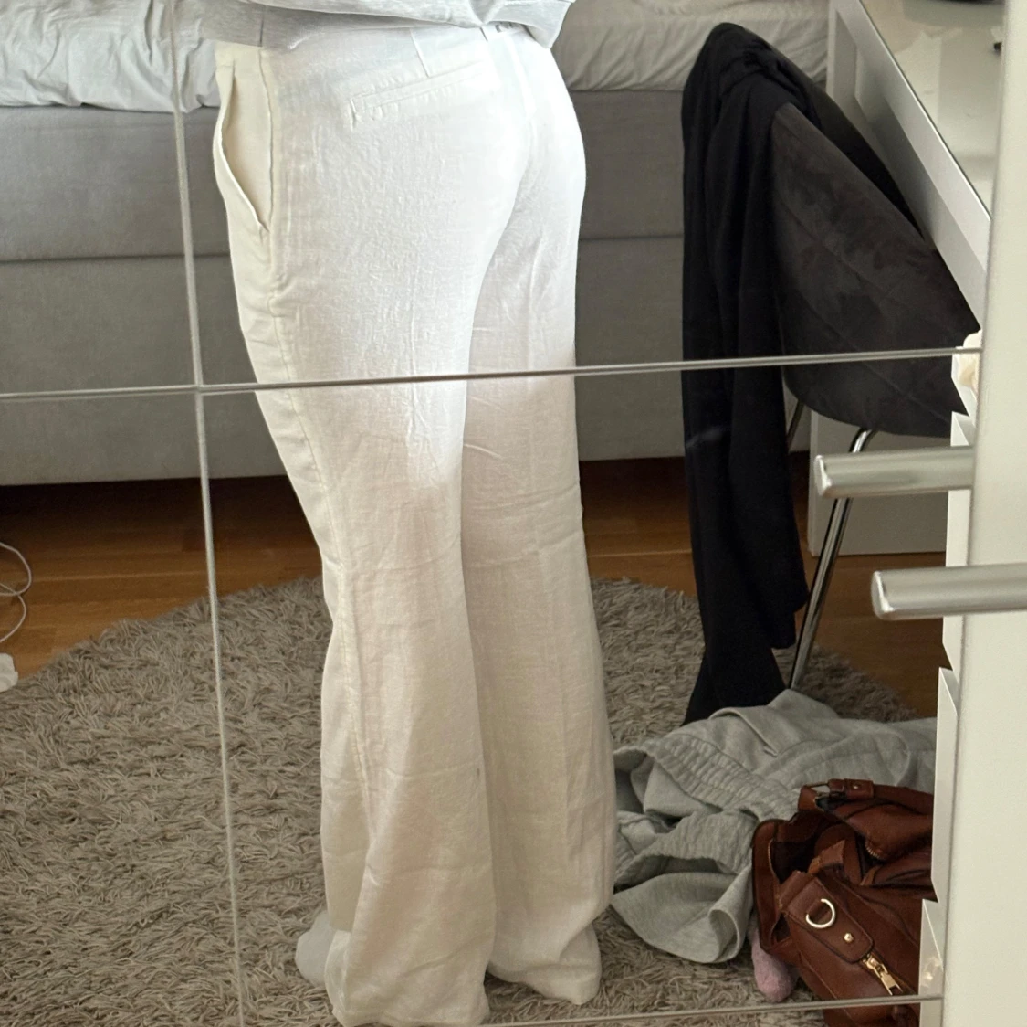Säljer dessa vita linnebyxorna som ser ut som kostymbyxor, men där jag köpte två olika storlekar. Helt slutsålda på hemsidan. Bootcut och low/mid waisted. Hör av dig vid frågor, enbart provade med lappen kvar🥰