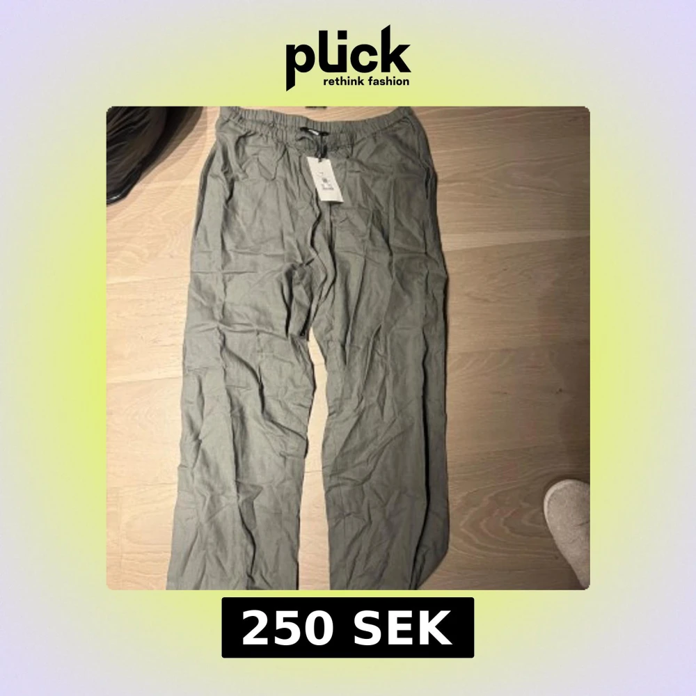Säljer ett par gröna linnebyxor från Bik Bok i storlek M. Byxorna har en loose passform med elastisk midja för extra komfort. Perfekta för en avslappnad stil.