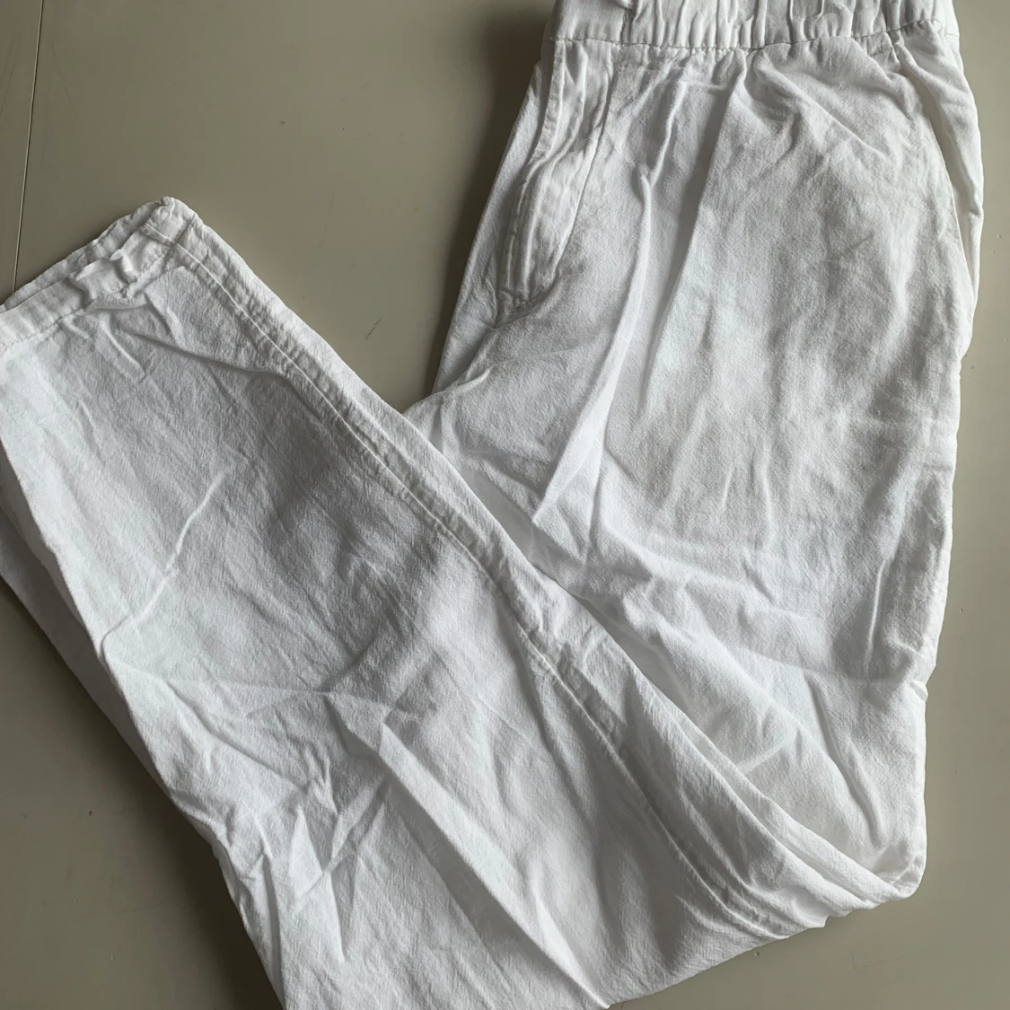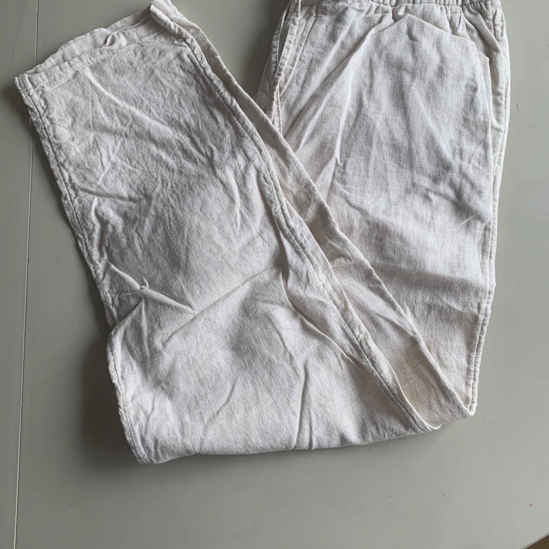 Säljer ett par vita och ett par beigea linnebyxor med avslappnad passform och resår i midjan. Perfekta för varma dagar och enkla att matcha med olika toppar. Byxorna har sidfickor och är tillverkade i ett lätt och luftigt material.