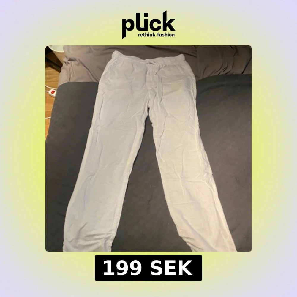 Säljer ett par ljusgrå linnebyxor med avslappnad passform och snörning i midjan. Perfekta för en chill och bekväm stil, lätta och luftiga med raka ben. Passar dig som gillar enkel och stilren look.