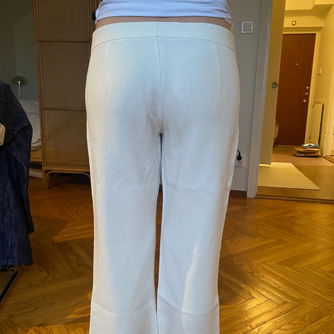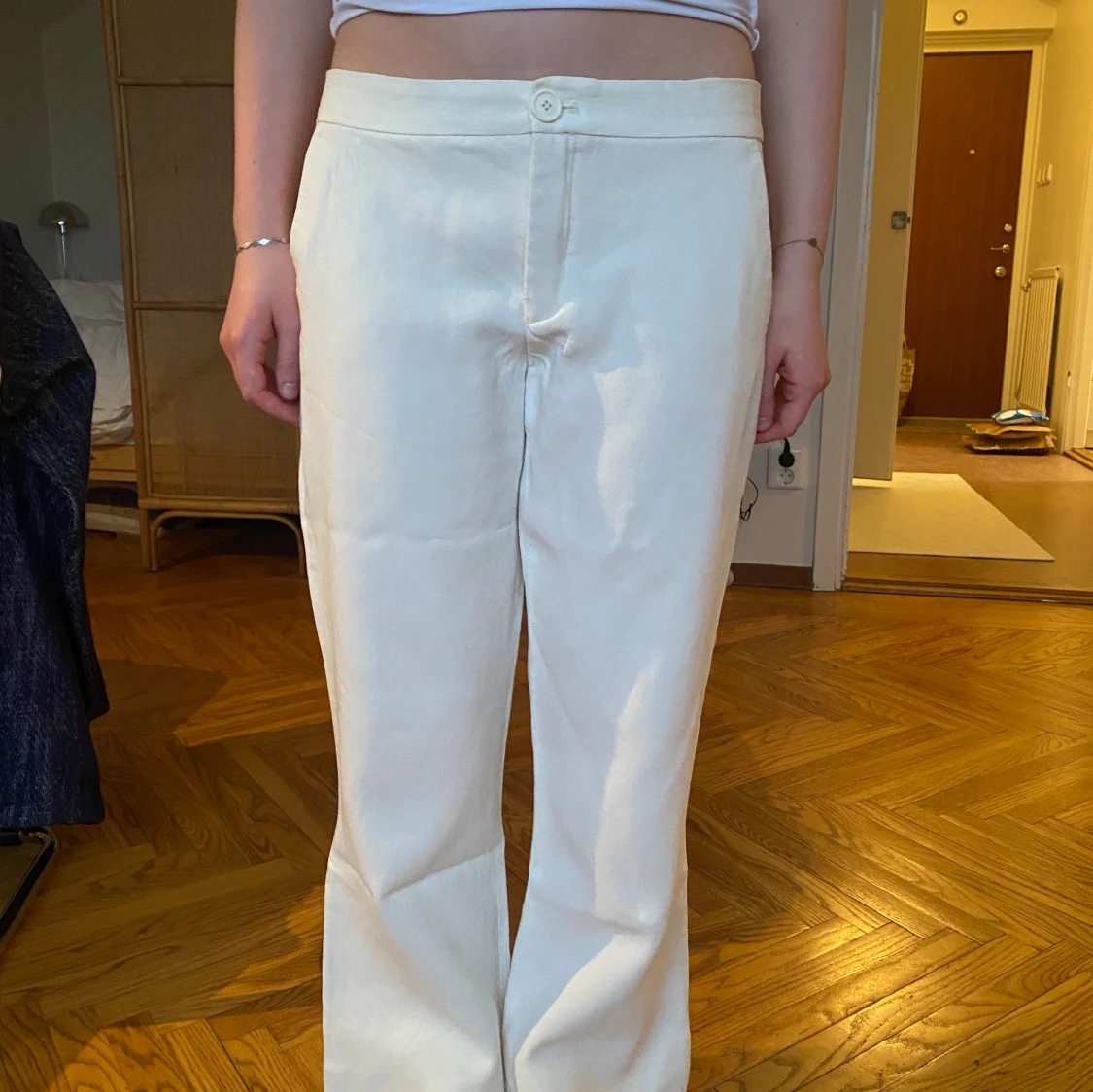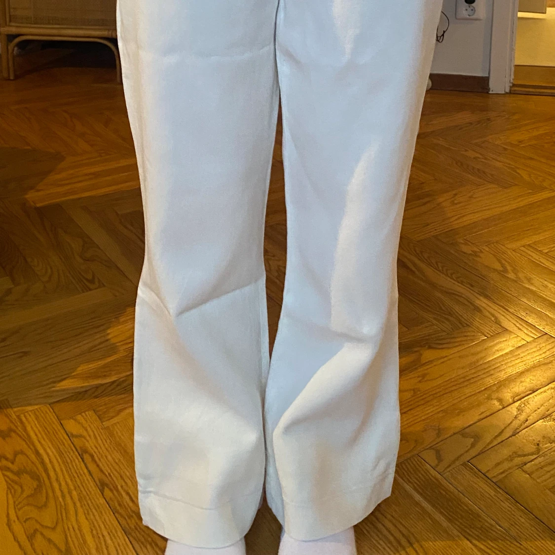 Vita linnebyxor. Fint skick! Midjemått: ca 85 cm. Innerbenslängd: ca 70 cm. (Uppsydda 10 cm går att sprätta bort blir då 80 cm). Storlek 36/S.