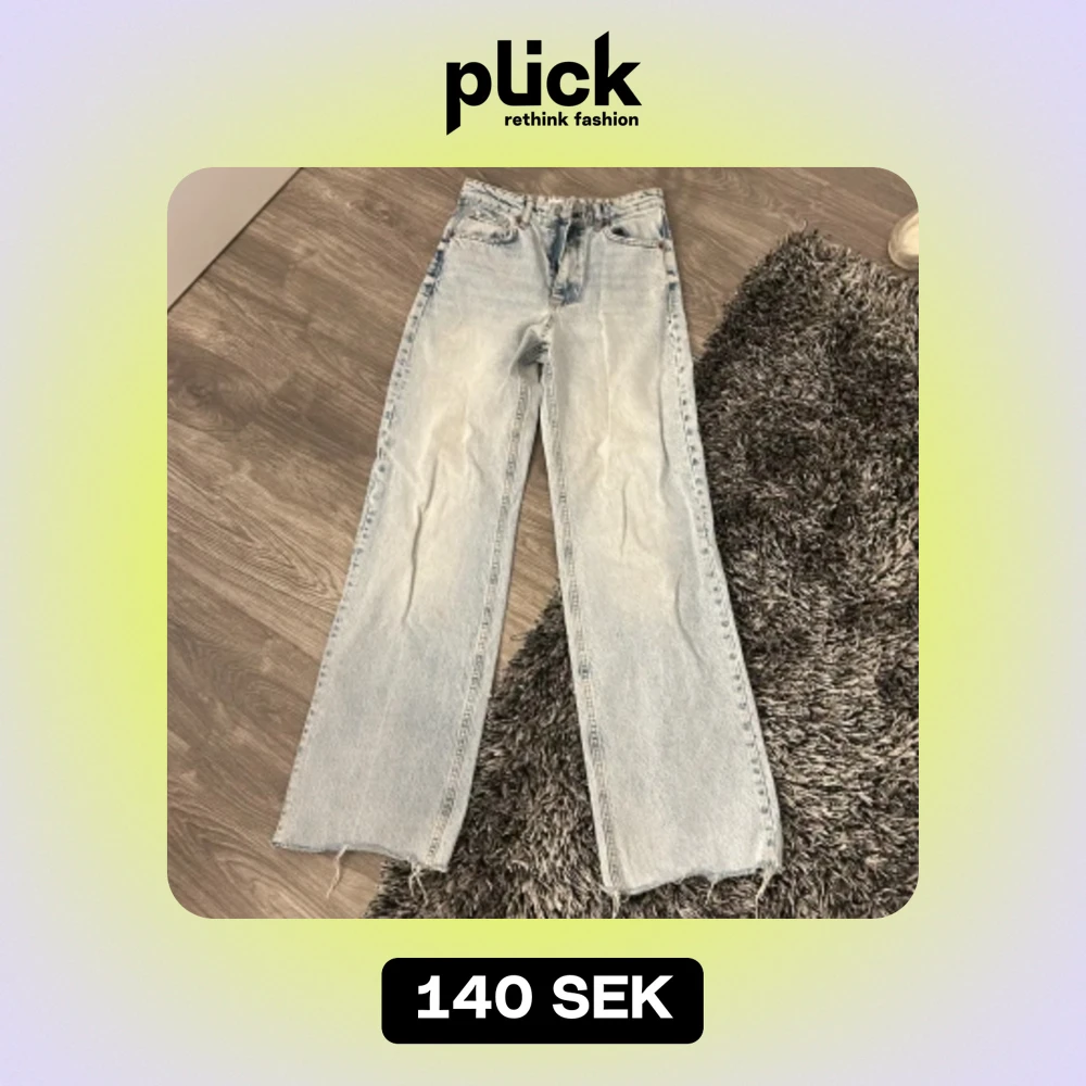 Väldigt bra kvalité. Jeansen är högmidjade. Det förekommer slitningar vid fötterna. Det finns en fläck under knäet.