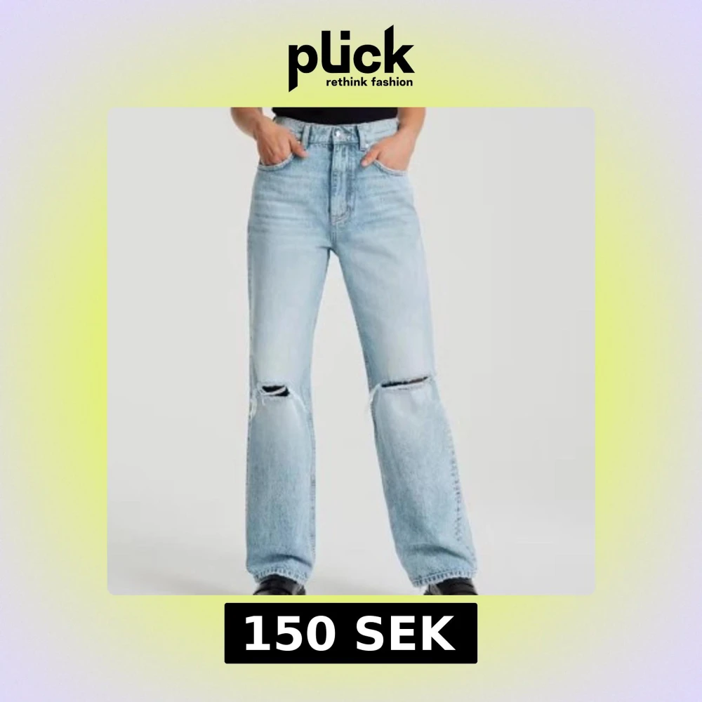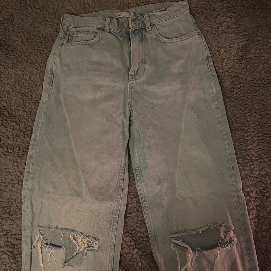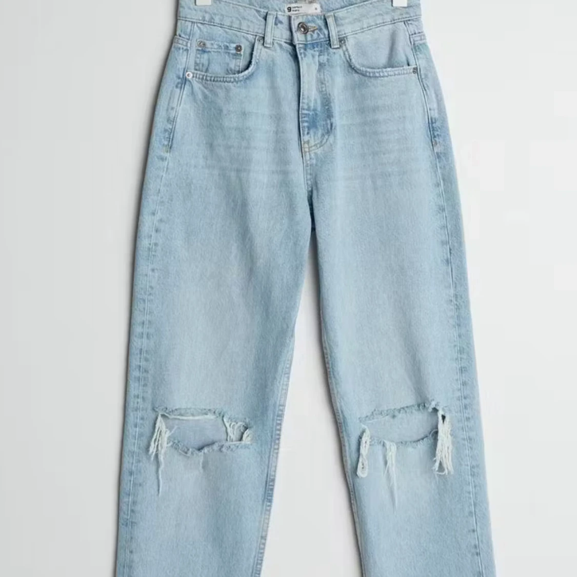 Snygga ljusblå jeans med slitningar på knäna. De har en hög midja och en rak passform som ger en avslappnad look. Perfekta för en trendig stil.