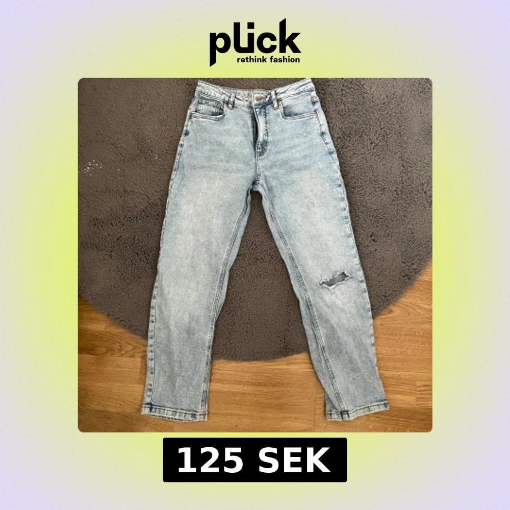 Säljer ett par ljusa jeans med hög midja och en cool slitning på ena benet. De har en klassisk femficksdesign och stängs med dragkedja och knapp. Perfekta för en avslappnad stil. Priset går att diskutera och om du vill ha fler bilder så är det bara att säga till!