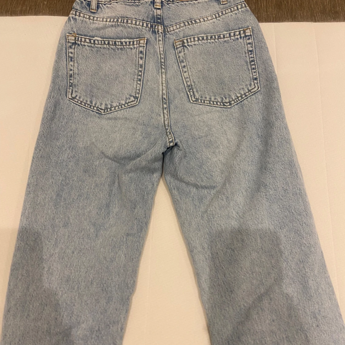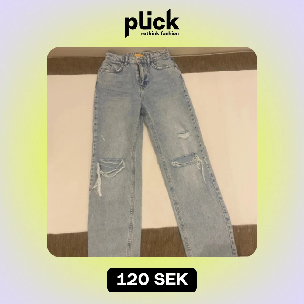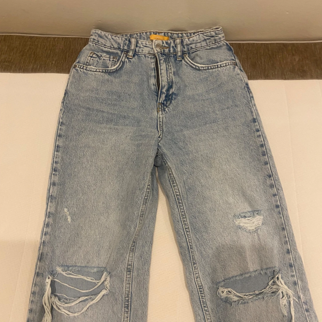 Säljer ett par ljusa jeans med slitningar på knäna och låren. De är i en straight fit och har en hög midja. Perfekta för en avslappnad och trendig look. Passar bra till både vardag och fest!